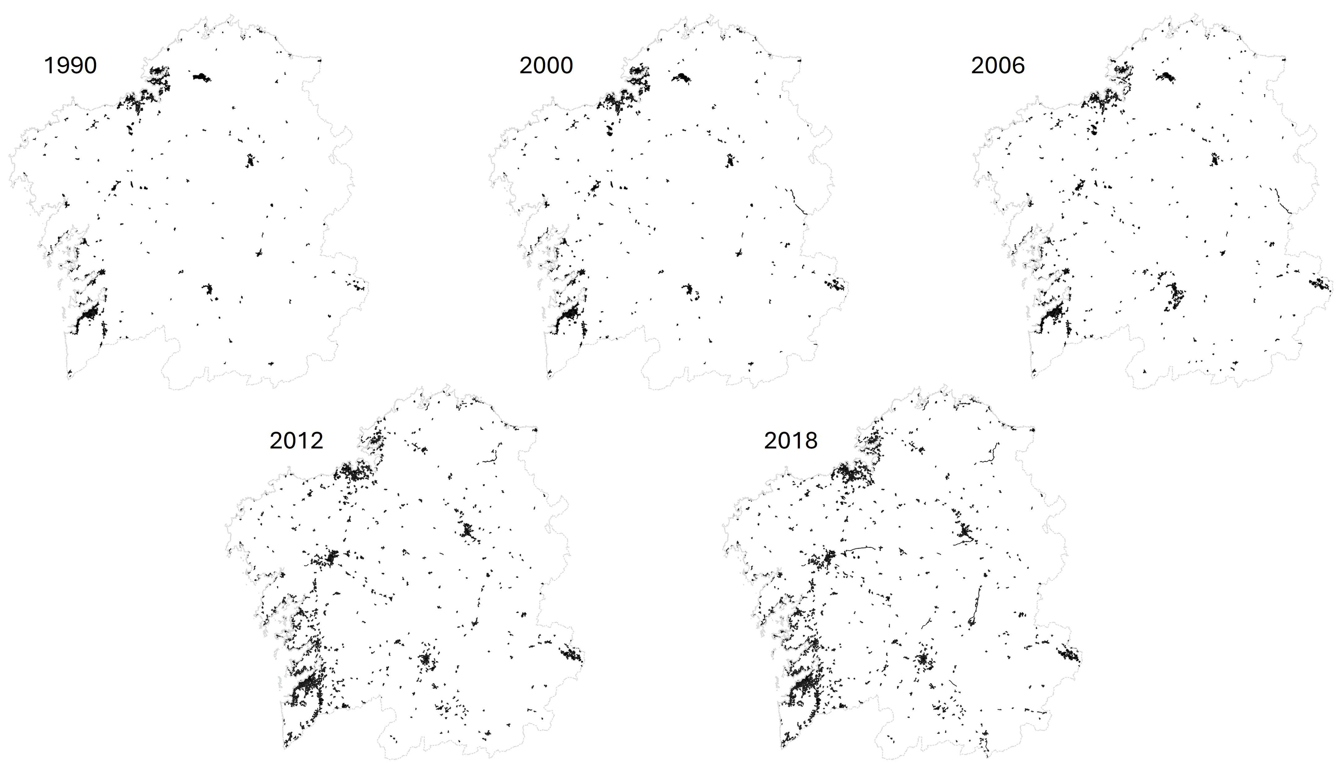 Según los datos aportados por el proyecto CORINE Land Cover (CLC) sobre la ocupación del suelo en Galicia, se puede apreciar como en un periodo de casi treinta años, la superficie artificial en Galicia aumentó algo más de un 70% en todo el territorio (Fig. 5). Este es un dato que hay que manejar con cautela, ya que entre el CLC de 2006 y 2012 existe un cambio metodológico que supuso una pérdida de la estabilidad comparativa a nivel temporal entre las diferentes versiones, siendo la cobertura artificial subestimada -es decir se ha omitido información de esta categoría- en los CLC anteriores al cambio metodológico (Martínez Fernández & Ruiz Benito & Jornet, 2018) El nivel de omisión de la información no influye en lo que se puede apreciar perfectamente en la imagen, el contraste de la estructura territorial gallega. Por un lado, el litoral, dominado por el denominado Eje Atlántico, que se va conformando con el paso de los años e intensificando la ocupación artificial del suelo. Este es el sector más dinámico en el que se encuentran cinco de las principales ciudades y sus áreas urbanas, así como importantes áreas rururbanas en los que la urbanización ha experimentado un gran avance. Por otro lado, el interior de la región está asociado a un carácter más rural y a un espacio regresivo, pero en el que podemos encontrar algunos espacios con una tendencia diferencial. Estas son las dos capitales de provincia, las poblaciones de la mariña lucense, las áreas ligadas a una actividad industrial como la comarca de Valdeorras o el municipio de As Pontes de García Rodríguez, o algunas villas y pequeñas ciudades que se han convertido en centros de atracción de su entorno más próximo siendo las únicas que presentan cierto grado de dinamismo demográfico.
