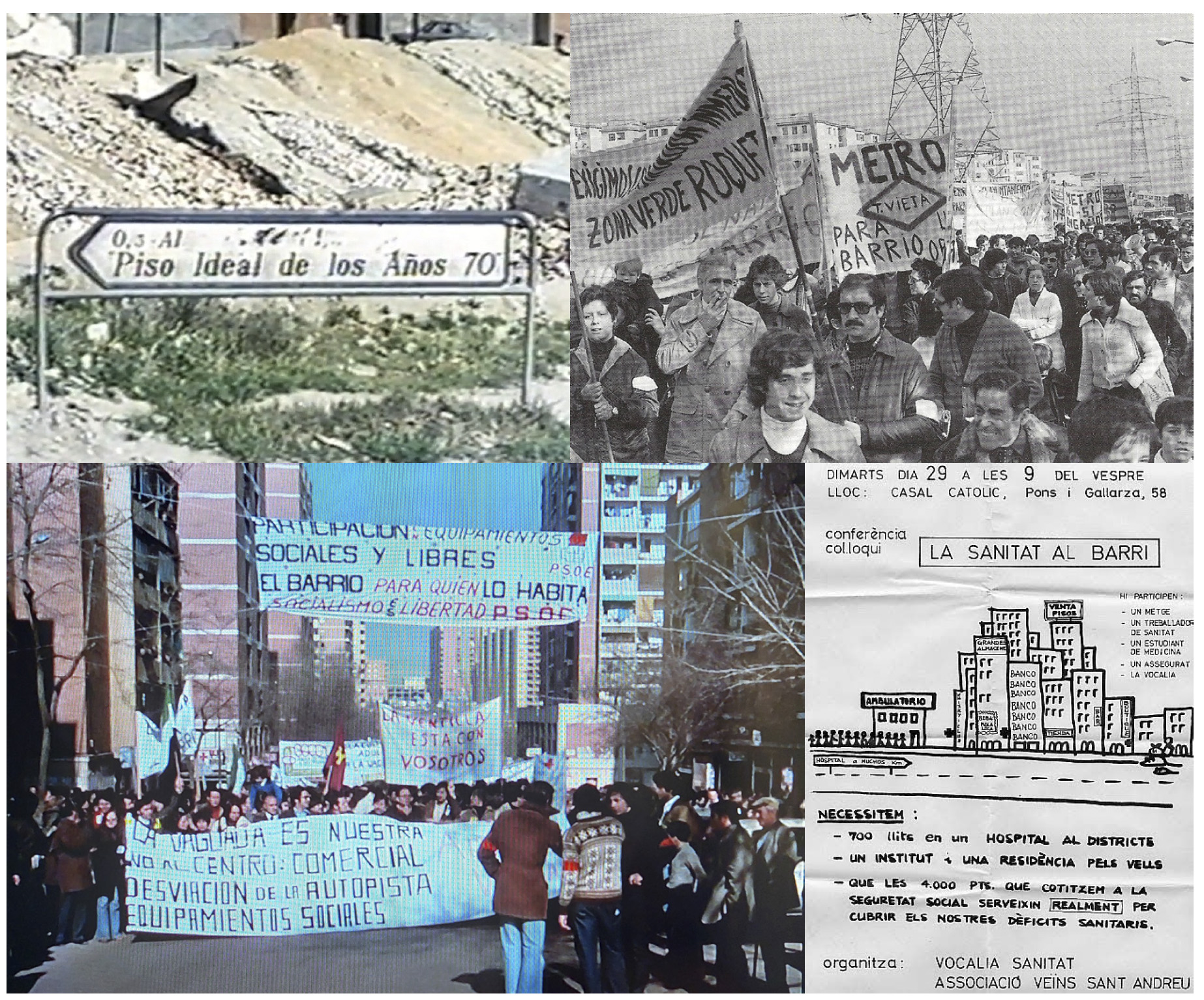 Fig. 1 Los déficits heredados y las demandas ciudadanas. Arriba izquierda: Cartel Piso Ideal de los Años 70 en medio de un descampado. Arriba derecha: Movimiento vecinal reivindicativo en Barcelona. Abajo izquierda: Movimiento vecinal La Vaguada es nuestra (Madrid). Abajo derecha: Octavilla anunciando la conferencia coloquio “La sanitat al barri” en Sant Andreu (Barcelona)