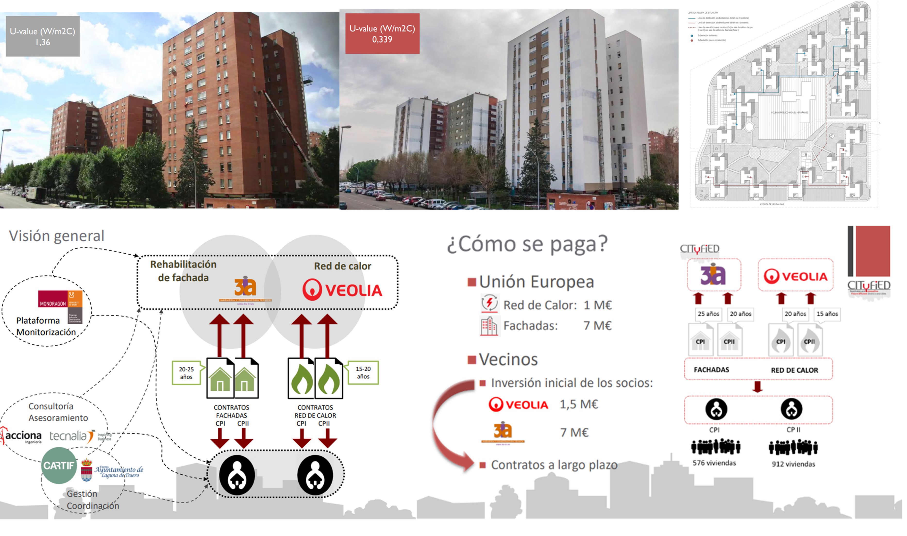 55 Con una inversión total de 61,2 millones de € (44,6 millones en rehabilitación de las viviendas y 16,5 para los espacios públicos), con un reparto del 25% de financiación privada y del 75% de subvenciones públicas, de las cuales 30% correspondieron al Ministerio, otro 30% a la Comunidad de Madrid, y 40% al Ayuntamiento. El coste medio por vivienda fue de unos 35 000 €. (Morcillo & al, 2016).