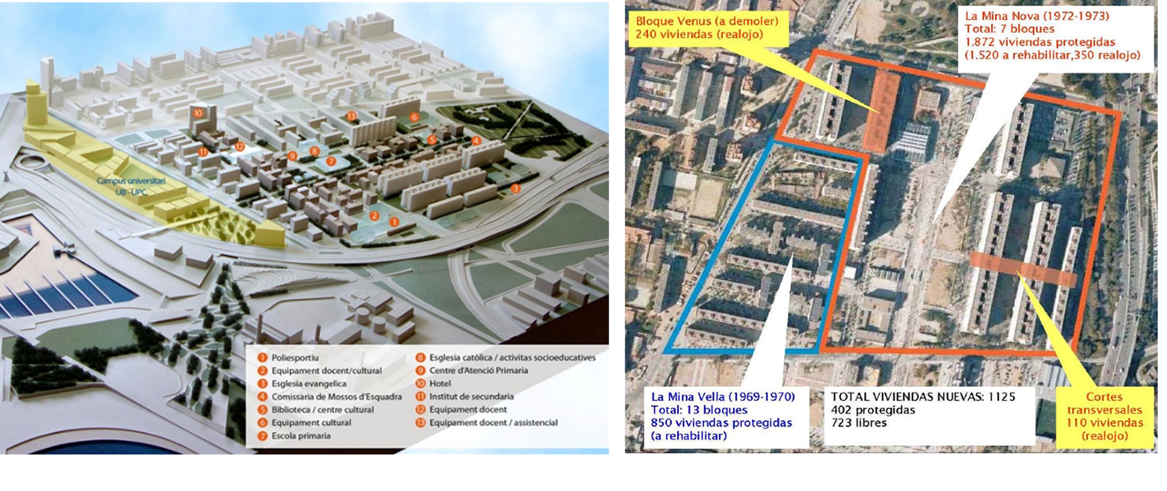 4.2.2 Un ejemplo de Programa URBAN como catalizador: el Barrio La Mina "Soy un perro callejero/ Y yo digo qué más da/ Vivo solo y como puedo/ ¿Qué me dio la sociedad?" Canción de la Banda sonora de la película "Perros Callejeros II" (1980), dirigida por José Antonio de la Loma, cantada por los Chunguitos El Barrio de la Mina (Fig. 13) surgió en 1969 como un polígono unitario promovido por el Patronato Municipal de la Vivienda del Ayuntamiento de Barcelona sobre terrenos agrícolas comprados al municipio de Sant Adrià de Besòs, con el objetivo de realojar distintos núcleos marginales de infravivienda (“barracas”) existentes en el área metropolitana como el Campo de la Bota, la Perona, Pekín, el Somorrostro, Can Tunis o las laderas de Montjuïc. La construcción y ocupación del barrio entre 1973 y 1974 fue muy rápida, de manera que en 1975 ya había más de 2000 viviendas, con 2222 familias empadronadas y 15 133 habitantes. Esta génesis hizo que desde su origen existieran grandes carencias sociales, laborales, culturales y económicas25, que se agravaron aún más en los años 80 con la llegada de la droga, el estallido de la delincuencia, la ocupación de viviendas y la progresiva consolidación de un estigma de marginalidad26 para La Mina que aún se arrastra. Estos factores sociales se vieron acentuados por la segregación del barrio y su aislamiento urbanístico con el entorno (por barreras como el río Besòs, la línea de tren y la ronda del Litoral), la falta de equipamientos, y la mala concepción del espacio público, todo lo cual provocó una espiral de deterioro, de modo que a finales de los años 90 se hizo imprescindible plantear una intervención global a largo plazo. Fig. 13 Izquierda: Maqueta del Plan Especial de Reordenación y Mejora (PERM) indicando los nuevos equipamientos. Derecha: Esquema explicativo de las viviendas demolidas y nuevas Fuentes: Plan de Transformación del Barrio de la Mina (PTBM) Memoria de actuaciones En este contexto, en el año 2000 se creó el Consorcio del Barrio de la Mina, constituido por la Generalitat de Catalunya, la Diputación y los Ayuntamientos de Sant Adriá y de Barcelona. Tras un intenso proceso participativo en 2001 se redactó el Plan de Transformación del Barrio de la Mina (PTBM), con dos grandes ejes: acciones sociales enmarcadas dentro de un Plan de Actuación Social, y actuaciones urbanísticas, recogidas en un Plan Especial de Reordenación y Mejora (PERM) elaborado en 2002 por el equipo de arquitectos Jornet-Llop-Pastor que mereció el Premio Nacional de Urbanismo en 2006. En principio, el PTBM contemplaba un horizonte hasta 2010, que se ha ido extendiendo hasta la actualidad, garantizando un flujo de inversión sostenido en el tiempo. Dentro del Plan de Actuación Social -desarrollado en programas anuales- se han llevado a cabo más de 50 acciones con 7 grandes líneas de actuación: formación e inserción sociolaboral; conciliación de la vida familiar y laboral; desarrollo económico local; participación y desarrollo comunitario; mejora de la convivencia y el civismo; apoyo social y educativo; y espacio público y civismo. Por su parte, el Plan Especial de Reordenación y Mejora (PERM) partió de 3 claros objetivos: mejorar la interrelación de La Mina con su entorno, abriendo conexiones con las nuevas áreas contiguas que se habían desarrollado con posterioridad al barrio (Diagonal Mar, el área del Forum 2004 y el futuro campus universitario del Besòs); aumentar la variedad urbana, mediante la introducción de nuevos espacios, tipologías de vivienda y servicios, así como la diversificación de usos y actividades; y, la creación de centralidad, configurando elementos de referencia e identidad para favorecer la convivencia vecinal. Las actuaciones concretas incluyeron: 1) la reurbanización completa del espacio público del barrio, con el derribo de varios edificios para la creación de un eje central a modo de “rambla” por el que se introdujo una línea de tranvía (T6 del Trambesòs, inaugurada en 2008) que permite la integración del barrio con la red de transporte público; 2) la construcción de nuevos equipamientos públicos: una biblioteca, una guardería, una escuela, un instituto, un polideportivo, una comisaría, y un centro religioso (Fig. 13); 3) la rehabilitación de la edificación existente, incluyendo también la instalación de ascensores; y 4) la construcción de 1145 nuevas viviendas, unas 400 de carácter protegido (para realojar a las familias de los bloques demolidos) y más de 700 libres, para introducir variedad social en el barrio y contribuir con su venta a la financiación de las actuaciones27 (Fig. 14). INVERSIÓN SEGÚN