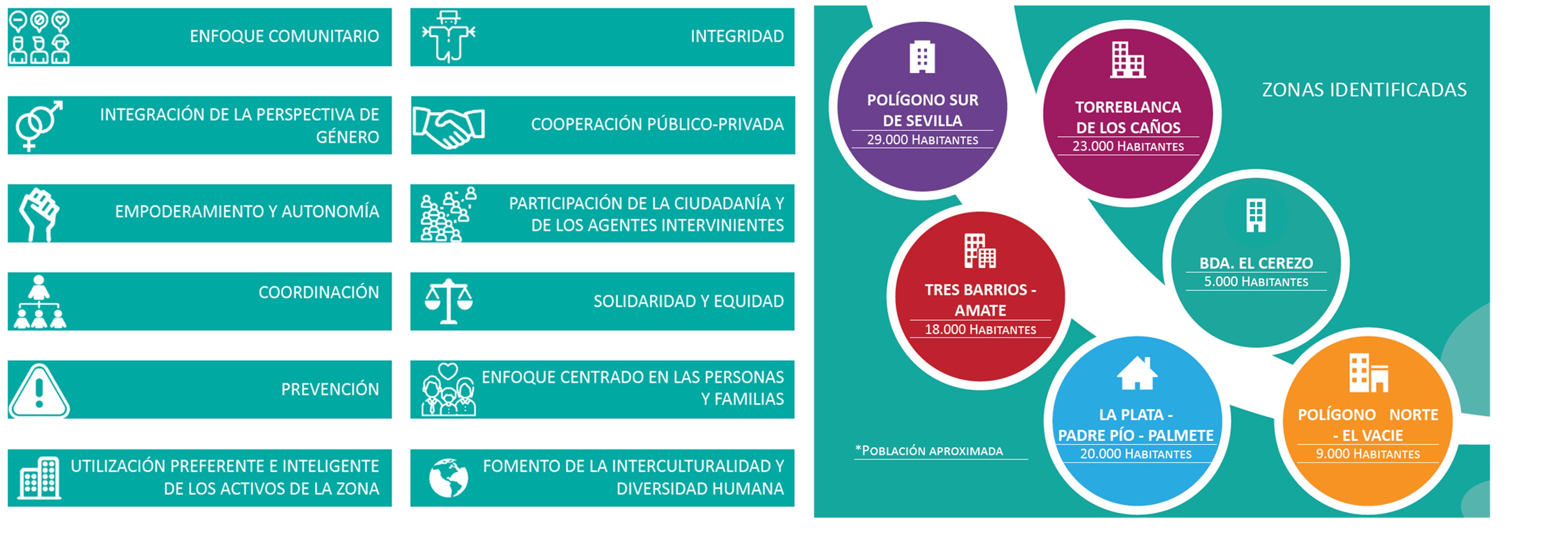 70 Los principios son: enfoque comunitario; integración de la perspectiva de género; empoderamiento y autonomía; integralidad; cooperación público-privada; participación de la ciudadanía y agentes intervinientes; coordinación; prevención; utilización preferente e inteligente de los activos en la zona; solidaridad y equidad; enfoque centrado en las personas y en las familias; y fomento de la interculturalidad y diversidad humana. Los ejes: Eje 1: Desarrollo económico y comunitario sostenible. Eje 2: Políticas públicas para el bienestar y la cohesión social. Eje 3: Mejora del hábitat y la convivencia. Eje 4: Trabajo en red e innovación en la intervención social comunitaria.