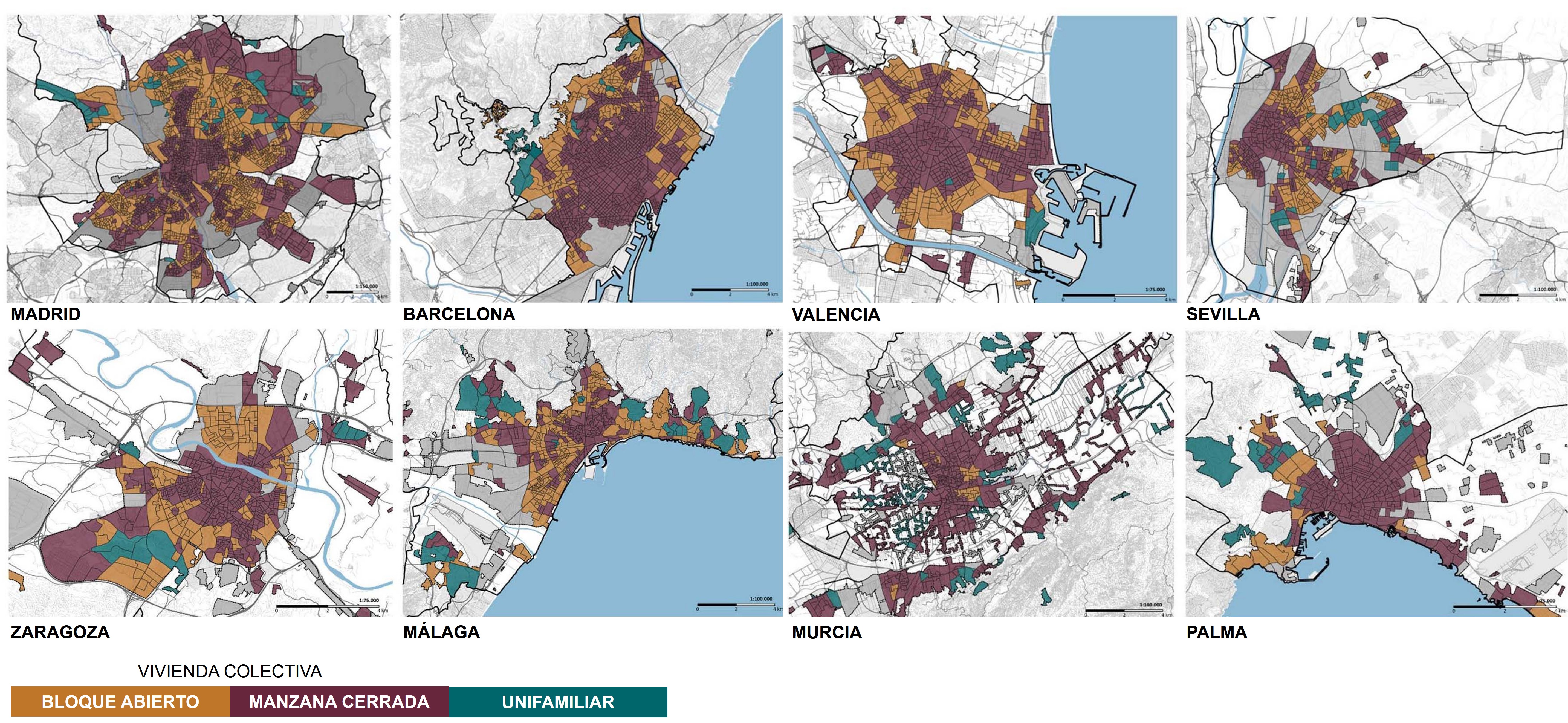 Fig. 4 Tipología de la edificación predominante por sección censal en las ocho mayores ciudades de España en 2021