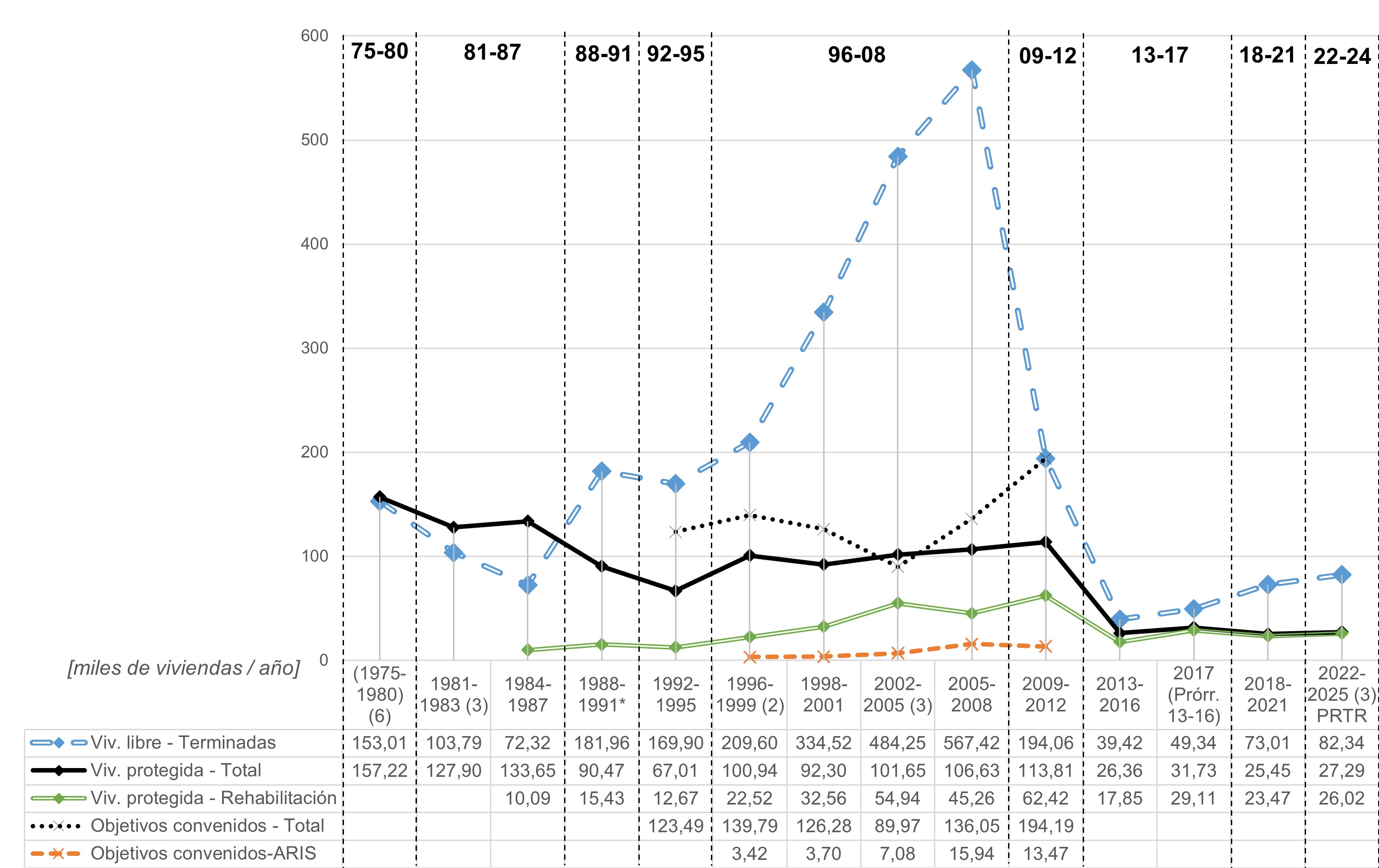 4.1.1 La rehabilitación de áreas en los Planes Estatales de Vivienda Con el Plan de Vivienda 1992-1995 el programa de ARI se consolidó como un programa más de los incluidos en los Planes Estatales de Vivienda (Hernández Aja & al, 2015). Además, se introdujo un cambio fundamental en el acceso a las ayudas a la rehabilitación que dejaron de vincularse a los ingresos de los promotores de las actuaciones, ante la dificultad que suponía la gestión y los pobres resultados que se habían obtenido (RD 726/19938). Desde 1992 han estado vigentes nueve Planes de Vivienda Estatales. Su programación es de cuatro años, aunque dos de ellos no la completaron y otro fue prorrogado durante un año. Este modelo inicial se desarrollaría sin solución de continuidad significativa mediante seis Planes de Vivienda Estatales9 que expandirían su capacidad inversora durante el periodo de la burbuja inmobiliaria. Este es un periodo de fuertes inversiones públicas, tanto en políticas de vivienda como en todo tipo de grandes obras públicas, apoyadas en el despliegue de la burbuja. El contexto expansivo de este periodo condujo a una proliferación de herramientas e instrumentos de inversión, que tendrían gran repercusión en la periferia heredada. En el mercado inmobiliario la expansión fue exponencial y alcanzó cifras inusitadas, apoyada en la gran afluencia de financiación que supuso la integración en la Unión Europea y la posterior unión monetaria. En la política de vivienda, históricamente el programa principal ha sido el de construcción de vivienda de protección oficial (VPO) destinada a venta. Es el que ha recibido mayores recursos y el que ha tenido volúmenes más significativos de producción, con máximos en la Transición y el inicio de la democracia. Las actuaciones e inversiones públicas en rehabilitación, y dentro de ella en rehabilitación urbana, son, en todo caso, testimoniales respecto al volumen de producción del mercado de obra nueva, y en especial del de vivienda libre (Fig. 7). La producción máxima de rehabilitación protegida se alcanzó con el último plan gestado en la burbuja inmobiliaria (2009-2012), con una producción anual media de algo más de 62.000 actuaciones. Si la evaluación se hiciera en cifras monetarias, el resultado sería aún menor, puesto que el gasto medio unitario por vivienda en rehabilitación es notablemente menor al de obra nueva. El programa de rehabilitación de áreas (ARI u otras denominaciones) se desarrolla sobre perímetros (polígonos) concretos que pueden ser propuestos por los ayuntamientos o la administración autonómica, por iniciativa propia o a iniciativa de los vecinos. La necesidad y previsiones de rehabilitación deben ser justificados en un documento técnico denominado Memoria-Programa. La declaración de ARI se produce en el seno de las Comisiones Bilaterales para el desarrollo de cada Plan formada por la administración central y cada una de las Comunidades Autónomas. Las actuaciones financiables en el programa de rehabilitación de áreas son de tipo físico, centradas en la rehabilitación de edificios (conservación, accesibilidad y sostenibilidad), reurbanización, y, sólo en los primeros Planes (hasta el 96-99), en lo que se denominaba equipamiento primario (dotaciones). Parte de los fondos se reservan a actuaciones de gestión, destinadas por lo general al establecimiento de oficinas de rehabilitación en las propias áreas. La participación vecinal se instrumenta a través de estas oficinas en muchos de los barrios, en un modelo de participación incompleta, puesto que por lo general se limitan a ofrecer información y funcionar como ventanilla única a efectos de tramitación. En los casos ejemplares en los que han existido procesos de participación estructurados, contaban con financiación y recursos adicionales a los previstos en los planes. Aunque el acceso a la financiación requiere evaluar parámetros y proponer medidas socioeconómicas necesarias para el área en las Memoria-Programa, los Planes Estatales de Vivienda no financian directamente intervenciones de este tipo. Fig.7 Producción anual de vivienda libre y protegida entre 1975 y 2024. Datos anualizados por periodos de programación de los Planes Estatales de Vivienda. Entre paréntesis se indica el número de años de vigencia de los Planes que no duraron 4 años Fuente: Elaboración propia a partir de Estadística de Vivienda Libre y Protegida del Ministerio de Vivienda y Agenda Urbana (MIVAU) y de los objetivos programados en los convenios firmados con las Comunidades Autónomas para el desarrollo de los Planes de Vivienda de periodo 1992-2012 Las Comunidades Autónomas gestionan los fondos procedentes de los Planes Estatales de Vivienda y acostumbran, aunque no en todos los casos, a programar recursos propios adicionales. Los ayuntamientos gestionan las actuaciones y las oficinas de rehabilitación y también pueden poner recursos adicionales a los estatales y autonómicos. Tanto la administración autonómica, como algunos de los ayuntamientos de mayor tamaño han contado con programas adicionales propios que se desarrollan de forma complementaria o paralela a la prevista en los Planes Estatales. Una fórmula habitual es que las tres administraciones pusieran fondos a partes iguales y los propietarios aportasen una cantidad variable, y en muchos casos inferior a la aportación pública. Como consecuencia de la crisis inmobiliaria y las políticas de austeridad y recorte del gasto público, durante la segunda década de este siglo se fue desmantelando la política de vivienda histórica: supresión de la VPO, venta de vivienda públicas y apuesta -al menos nominalmente- por la rehabilitación. La debacle inmobiliaria ha mantenido el mercado inmobiliario en niveles de producción discretos durante la última década. En materia de vivienda las modificaciones fueron múltiples en todos los niveles administrativos. Las Comunidades Autón