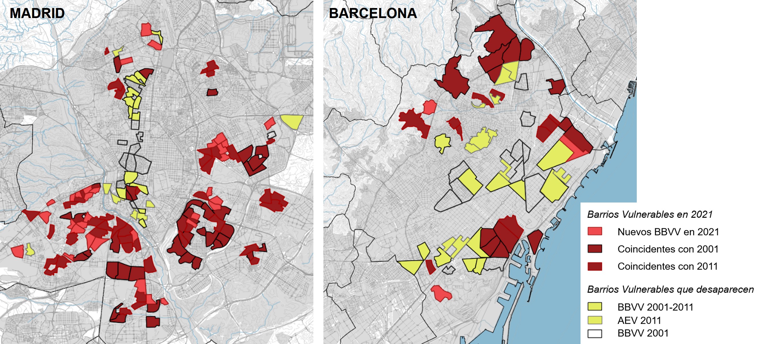 Fig. 5 Evolución de los barrios vulnerables detectados entre 2001 y 2021 en los municipios de Madrid y Barcelona