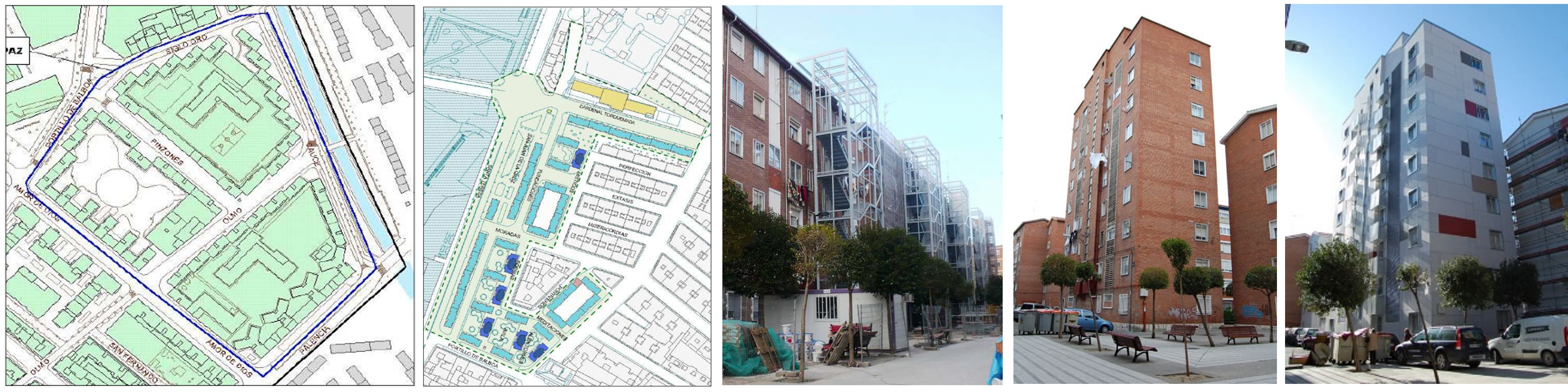4.1.3 El ARI de La Rondilla, en Valladolid: un ejemplo maduro del modelo de los últimos Planes Estatales "A veces llega un momento en que te haces viejo de repente/ Sin arrugas en la frente, pero con ganas de morir/ Paseando por las calles todo tiene igual color/ Siento que algo echo en falta, no sé si será el amor" La senda del tiempo. Canción de Celtas Cortos en el álbum "Gente Impresentable" 1990 Un ejemplo representativo del modelo de gestión y financiación de los Planes Estatales, en su fase de mayor madurez, es el del ARI de La Rondilla (Fig. 10). Se trata de un ámbito discontinuo, formado por dos polígonos residenciales en la periferia de Valladolid, realizados por el Instituto Nacional de la Vivienda (INV) y la Obra Sindical del Hogar (OSH), para alojamiento de los trabajadores llegados como consecuencia del éxodo rural: el “Polígono 18 de Julio” (iniciado en 1955, con 550 viviendas y un colegio), que hace charnela entre el casco histórico y el propio barrio de la Rondilla; y el “Polígono XXV Años de Paz” de 1962, que corresponde a tres grandes manzanas de frentes quebrados en diente de sierra, con 503 viviendas, 2 colegios y un parque. Los edificios presentaban numerosas deficiencias, como humedades en cubiertas, problemas en las instalaciones y falta de accesibilidad, al tener 5 plantas sin ascensor. Entre ambos polígonos suman en total 1056 viviendas, que se delimitaron como ARI por la Junta de Castilla y León mediante Acuerdo 164/2006 y se rehabilitaron en dos fases. Las obras de la Fase I afectaron a 41 edificios con 482 viviendas y se desarrollaron entre los años 2008 y 2010. La Fase II se inició en 2012, afectando a 35 edificios con 367 viviendas. ACTUACIÓN 1ª FASE COSTE TOTAL M. Vivienda JCyL Ayuntamiento Particulares Rehabilitación 7 802 945,00 2 367 000,00 1 995 841,00 1 099 063,60 2 341 040,40 Urbanización 1 913 670,50 382 734,10 263 000,00 1 267 936,40 0,00 Gestión 360 530,00 144 212,00 108 159,00 108 159,00 0,00 TOTAL 10 077 145,50 2 893 946,10 2 367 000,00 2 475 159,00 2 341 040,40 % 100,00% 28,72% 23,49% 24,56% 23,23% Fig. 9 Coste total de las actuaciones y reparto por agente en el ARI de la Rondilla. Primera Fase Fuente: Junta de Castilla y León Fig. 10 ARI de la Rondilla (Valladolid). Planos de localización, instalación de ascensores por el exterior e imágenes de la rehabilitación energética de las fachadas (antes y después) Fuente: VIVA. Sociedad Municipal de Suelo y Vivienda de Valladolid. https://www.smviva.com/portfolio-item/i-fase-ari-rondilla/ Las actuaciones contempladas dentro de los esquemas de los Planes Estatales de Vivienda permiten incluir la urbanización y la rehabilitación edificatoria. En el ARI de La Rondilla, la reurbanización (18,8% del presupuesto total) consistió en el rediseño completo del espacio público conformado por los diversos bloques y torres, mediante la reestructuración de la secuencia de espacios interbloque, diferenciando los de simple acceso a las viviendas (que se reordenaron y peatonalizaron) y las pequeñas plazas de función más estancial, donde se realizaron zonas ajardinadas. Anticipándose al planteamiento más integrado que propondría después el Plan Estatal 2013-2016, las obras de rehabilitación edificatoria (que absorbieron el 77,4% del presupuesto) fueron más allá de la mera conservación mediante la subsanación de las deficiencias existentes, incluyendo la accesibilidad (con la instalación de ascensores por fuera de los edificios) y la mejora de la eficiencia energética, con la colocación de aislamiento térmico por el exterior, renovando al mismo tiempo la imagen de la fachada. Como puede verse en el cuadro adjunto (Fig. 9), la inversión total por vivienda estuvo en torno a los 20 000 € de media, con una subvención por propietario de unos 14 000 €, de forma que las aportaciones privadas por vivienda rondaron los 5000 €. El reparto de la inversión se distribuyó casi a partes iguales (en torno al 25-30%)11 entre el Ministerio, la Junta de Castilla y León, el Ayuntamiento y los propietarios. En cuanto a la gestión, se realizó por la Sociedad Municipal de Suelo y Vivienda de Valladolid, con una cierta participación vecinal.