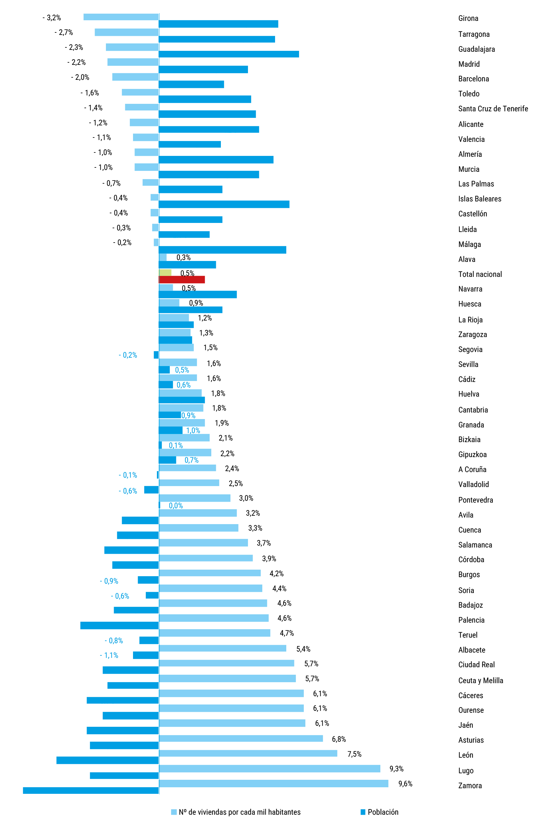 En este sentido, como refleja la Fig. 4, surgen dos grupos de provincias claramente diferenciadas en cuanto a oferta de vivienda disponible en relación con la población residente. Por un lado, aquellas en las que la ratio de viviendas por cada mil habitantes ha disminuido, entre las que se encuentran todas las provincias de costa mediterránea, Madrid y sus provincias limítrofes, Guadalajara y Toledo, y los territorios insulares, asociado a los fuertes aumentos demográficos descritos. Por contraparte, la mayoría de las provincias se encuentran en el lado opuesto de la ecuación, con fuertes descensos poblacionales que han hecho aumentar la ratio de vivienda por cada mil habitantes, incluso por encima del 9% en el caso de Lugo o Zamora.