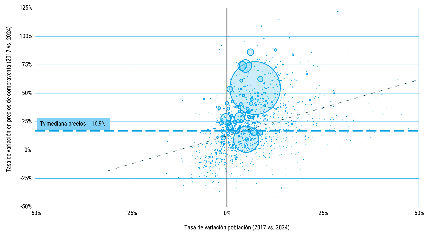 Combinando causa —variación de población y, por tanto, de demanda— y consecuencia —variación de precios— se observa que los mayores tensionamientos en el mercado inmobiliario se producen en municipios que aglutinan un alto porcentaje de la población total residente en España, así como en sus municipios limítrofes, fruto de la expansión de las ciudades comentada anteriormente. La estrecha vinculación entre crecimiento de población y crecimiento de precios se evidencia en que, del total de los 1 464 municipios analizados, un total de 694 (el 47,4% de los analizados), se encuentran por encima del crecimiento mediano tanto en población como en precios. Estos municipios representan más del 55% de la población española.