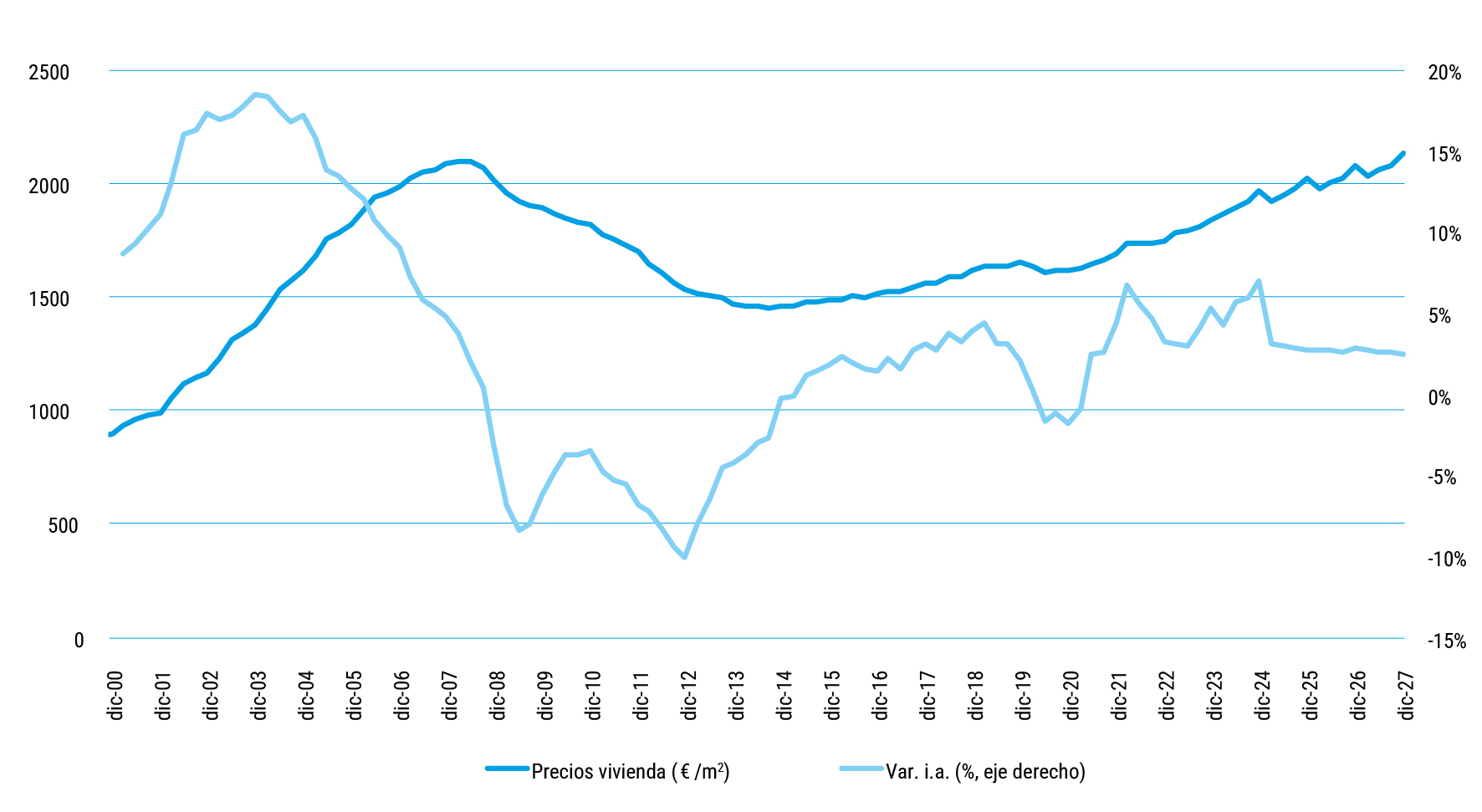 Fig. 10.Precio de la vivienda en venta (euros por metro cuadrado y variación interanual). Previsiones 2025- 2027