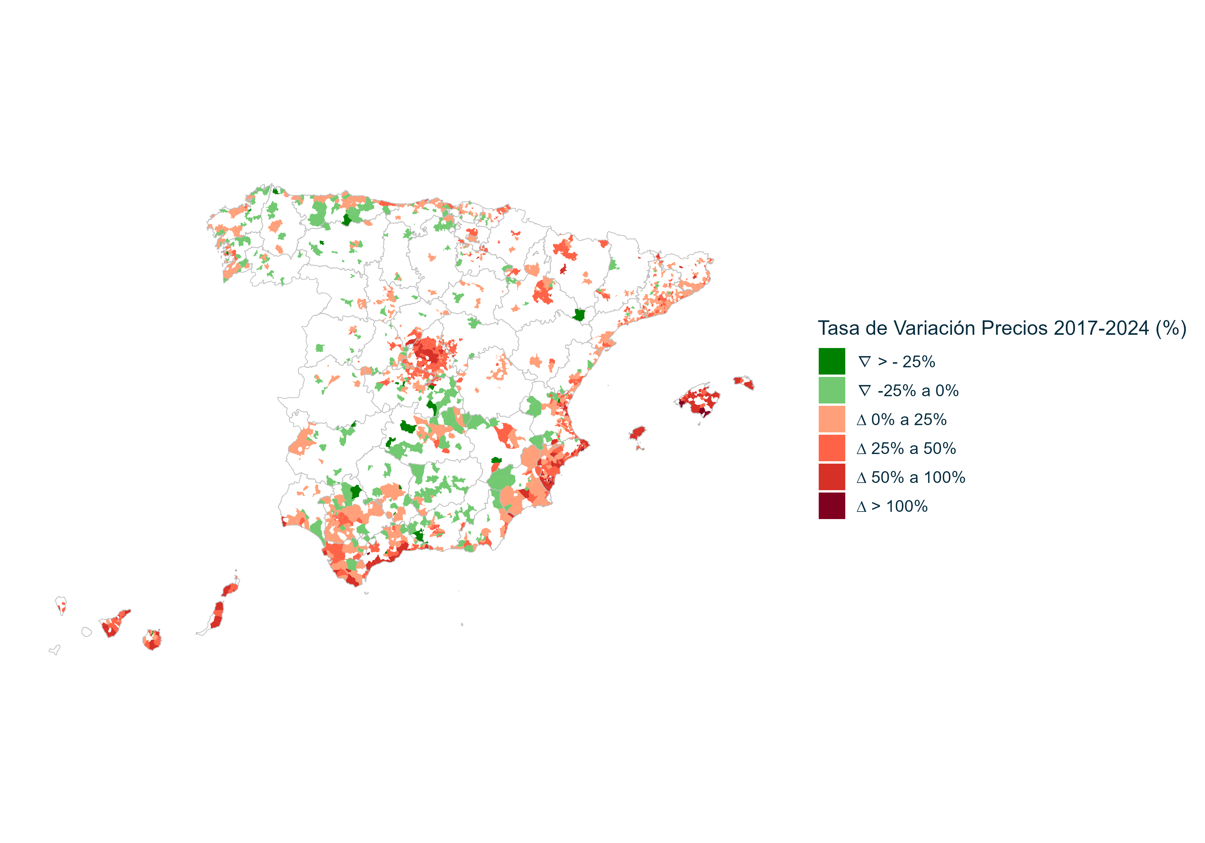 Por el contrario, en municipios del interior —o la España vaciada, haciendo referencia al despoblamiento que experimentan— los precios han disminuido con respecto a 2017, momento del tiempo en el que ya se encontraban bajos por el sostenido descenso producido tras el estallido de la burbuja inmobiliaria. En municipios como Elche de la Sierra (Albacete), Madrigalejo (Cáceres) o Bembibre (León), los precios se han reducido en más de un 30%, lo que confirma que el aumento de precios en promedio nacional esconde un fenómeno dual y viene principalmente liderado por los territorios anteriormente descritos. Si además se considera que aquellos municipios para los que no ha sido posible obtener el dato pertenecen a territorios con descensos importantes de población y pequeño tamaño, probablemente el número de municipios que han experimentado caídas de precio aumentaría, aunque esta hipótesis no es posible avalarla con la información pública disponible.
