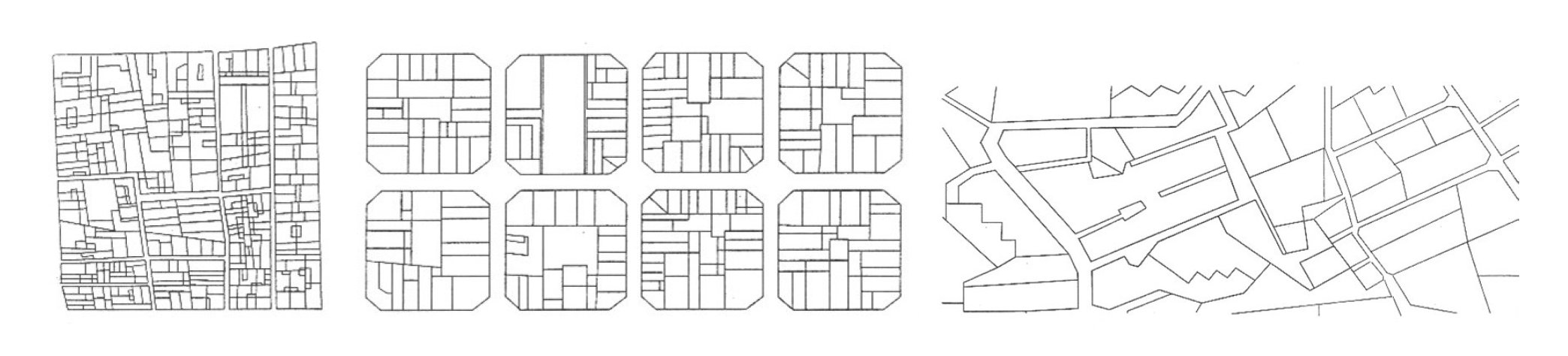 Fig. 1. Comparativa de parcelarios en tres barrios de Barcelona: Ensanche, Gràcia y Sant Ildefons. La imagen ilustra la evolución histórica y morfológica del parcelario como estructura base de la edificación residencial