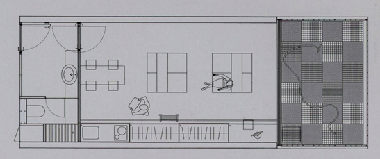 Fig. 2. Proyecto experimental de vivienda mínima de 30 m². Piso piloto diseñado por Iñaki Ábalos y Juan Herreros, basado en un espacio interior diáfano con fachada contenedor y jardín exterior concebido como “huerto conclusus”. Construmat 206