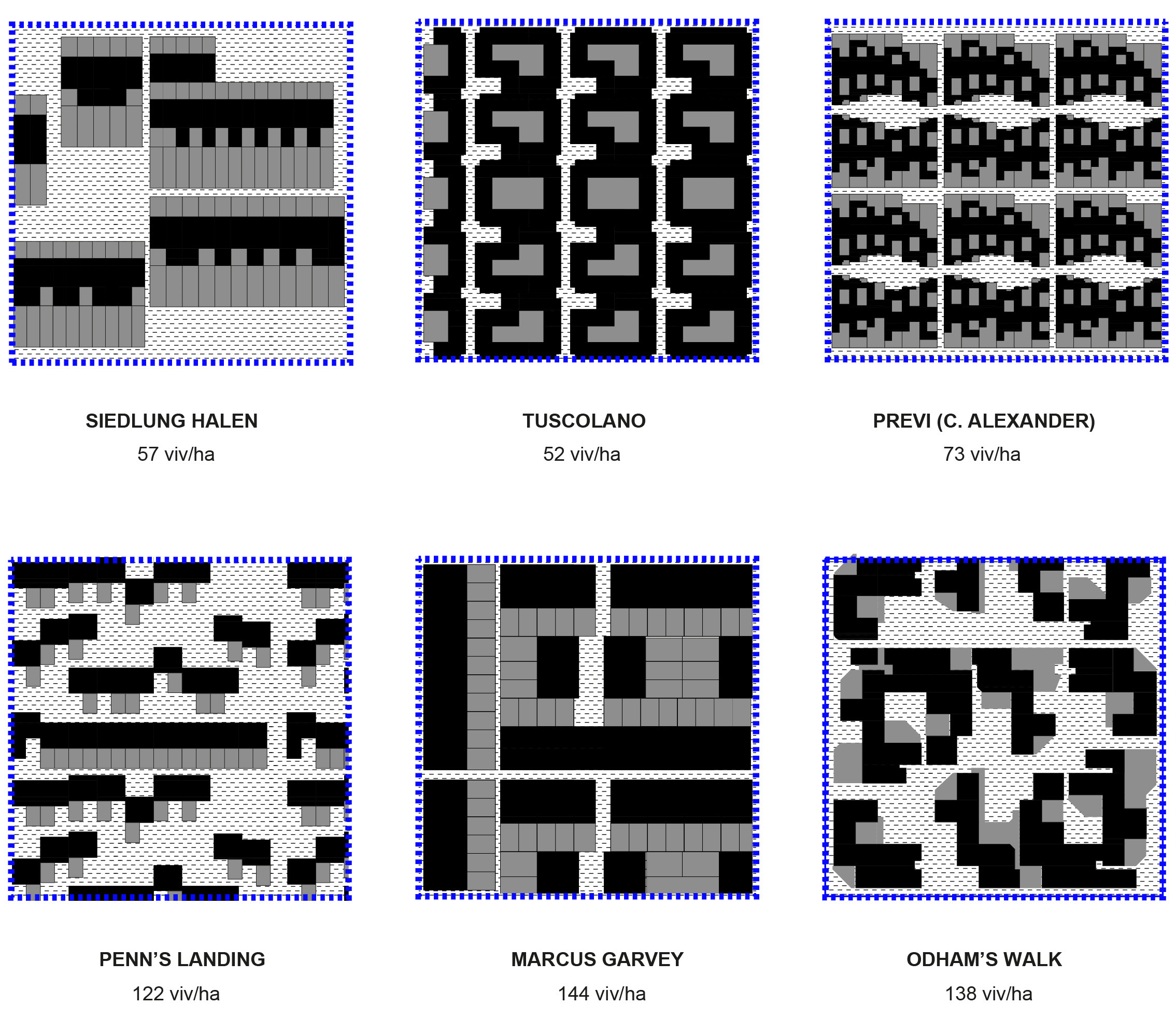 Fig. 2. Proyectos históricos canónicos del ideal baja altura y alta densidad / low-rise high-density; comparación de densidades “semi-brutas” potenciales, calculadas sobre una superficie de una hectárea, como un patrón de crecimiento abstracto (véase apartado de metodología)