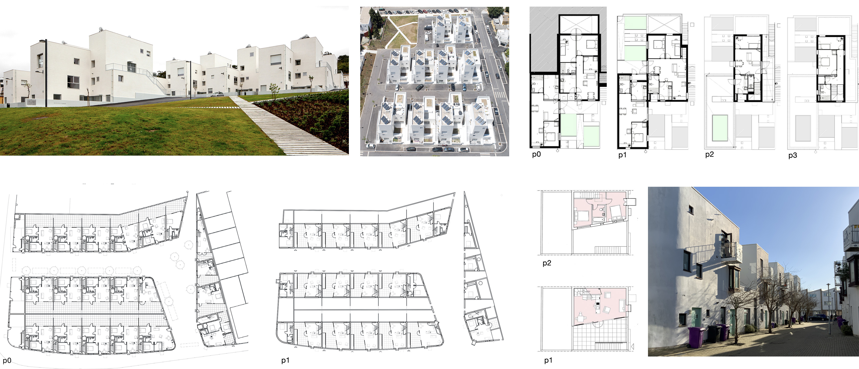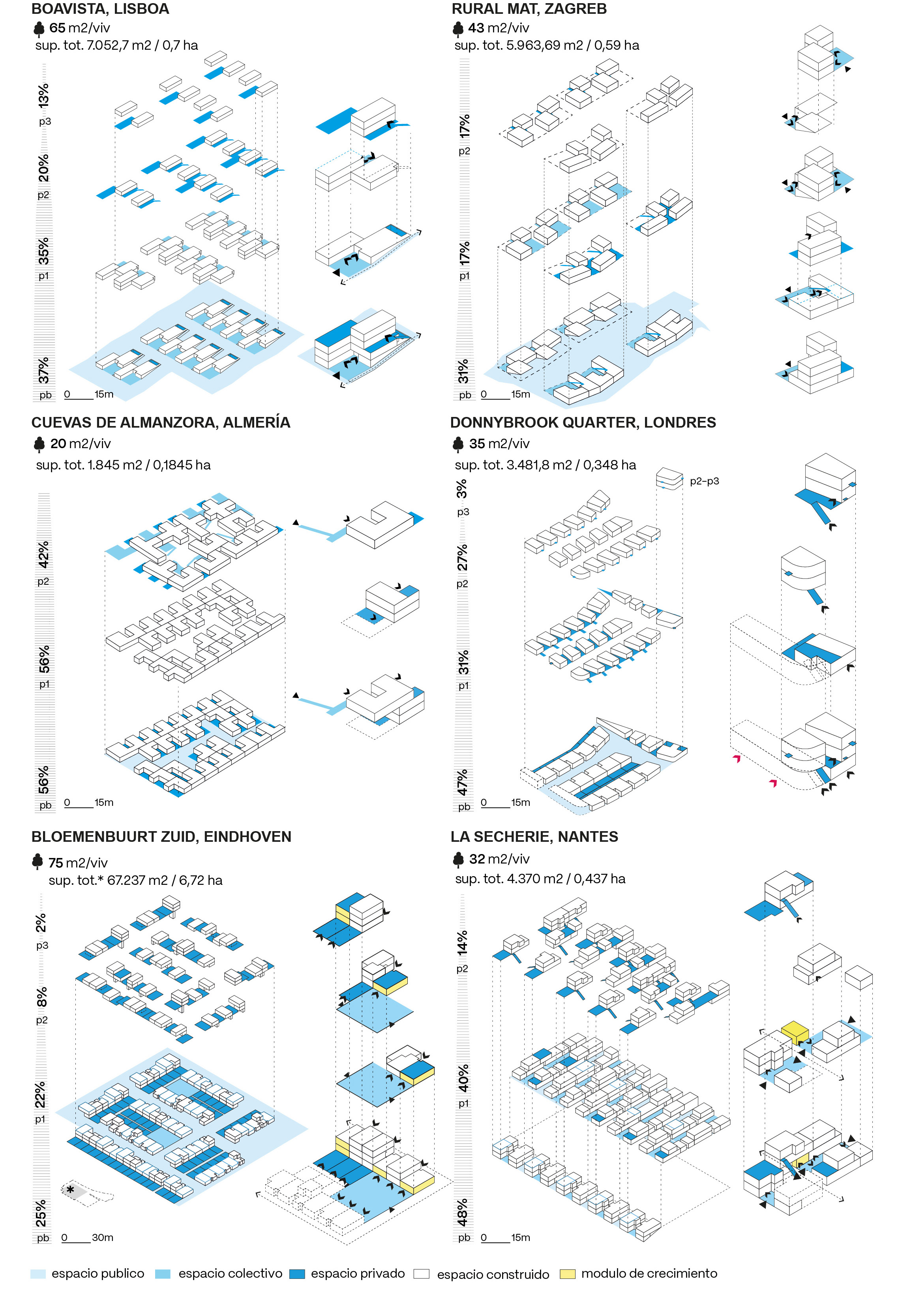 En cuanto al crecimiento como posibilidad de adaptación, los proyectos más densos ofrecen, como ya se ha dicho, espacios exteriores más acotados o delimitados por volúmenes construidos, que parecen más fácilmente susceptibles de ser ocupados por nuevos volúmenes, con la excepción, de nuevo, del proyecto de Nantes. Esta condición es singularmente clara en el proyecto más denso, el de Cuevas de Almanzora que, con sus 160 viviendas por hectárea, es el único en el que aparecen patios completamente delimitados por los que se iluminan y ventilan los espacios interiores. La misma configuración impide crecer sobre el espacio exterior sin afectar a la habitabilidad de las unidades. Por contraste, el caso de Londres demuestra que al moderar la densidad hacia el entorno de las 100 viviendas por hectárea es posible disponer espacios fácilmente apropiables, que se podrían ocupar con nuevas construcciones, como los de las terrazas privadas a nivel de planta primera. Ese crecimiento exigiría una reconfiguración de los huecos de las unidades altas para no perder habitabilidad, a costa de la privacidad de los jardines de planta baja. La semejanza del esquema con la célebre Quinta Monroy, un proyecto de vivienda crecedera de 2001-2004 elaborado por Alejandro Aravena y Elemental para Iquique, en Chile, es significativa en ese sentido.