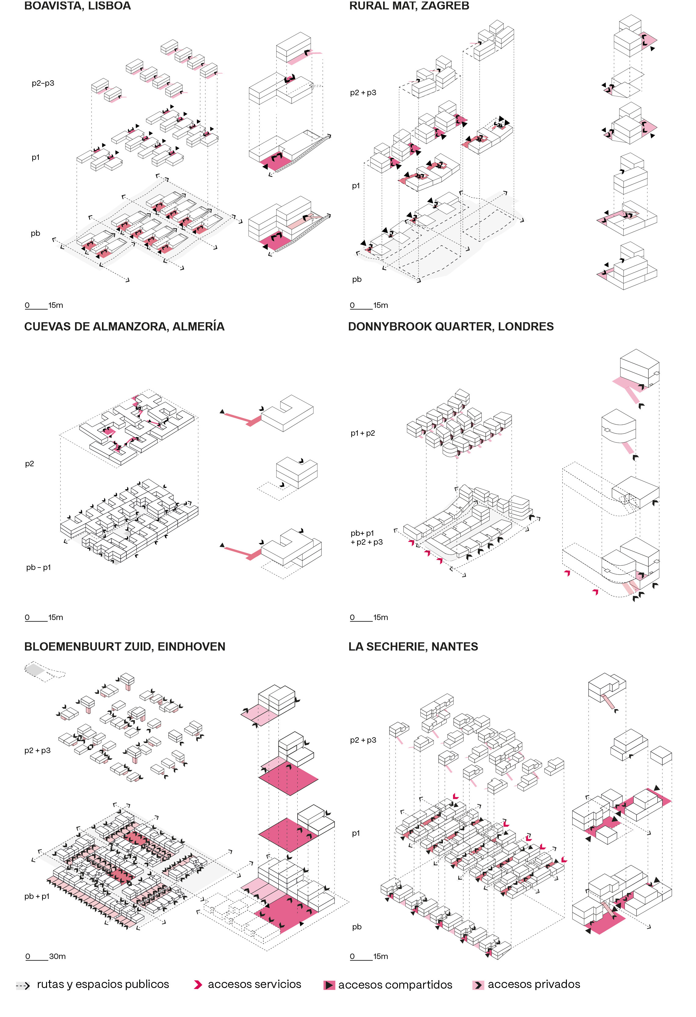 Fig. 8. Esquemas de análisis sobre la independencia de accesos en los seis casos europeos contemporáneos, con leyenda en el borde inferior. Esquemas axonométricos por niveles del conjunto y de los módulos básicos de la agregación a mayor escala, en columna a la derecha. Se indican las rutas de acceso en el espacio público, los puntos de acceso compartidos y privados a cada unidad y los espacios de tránsito exteriores sombreados en color