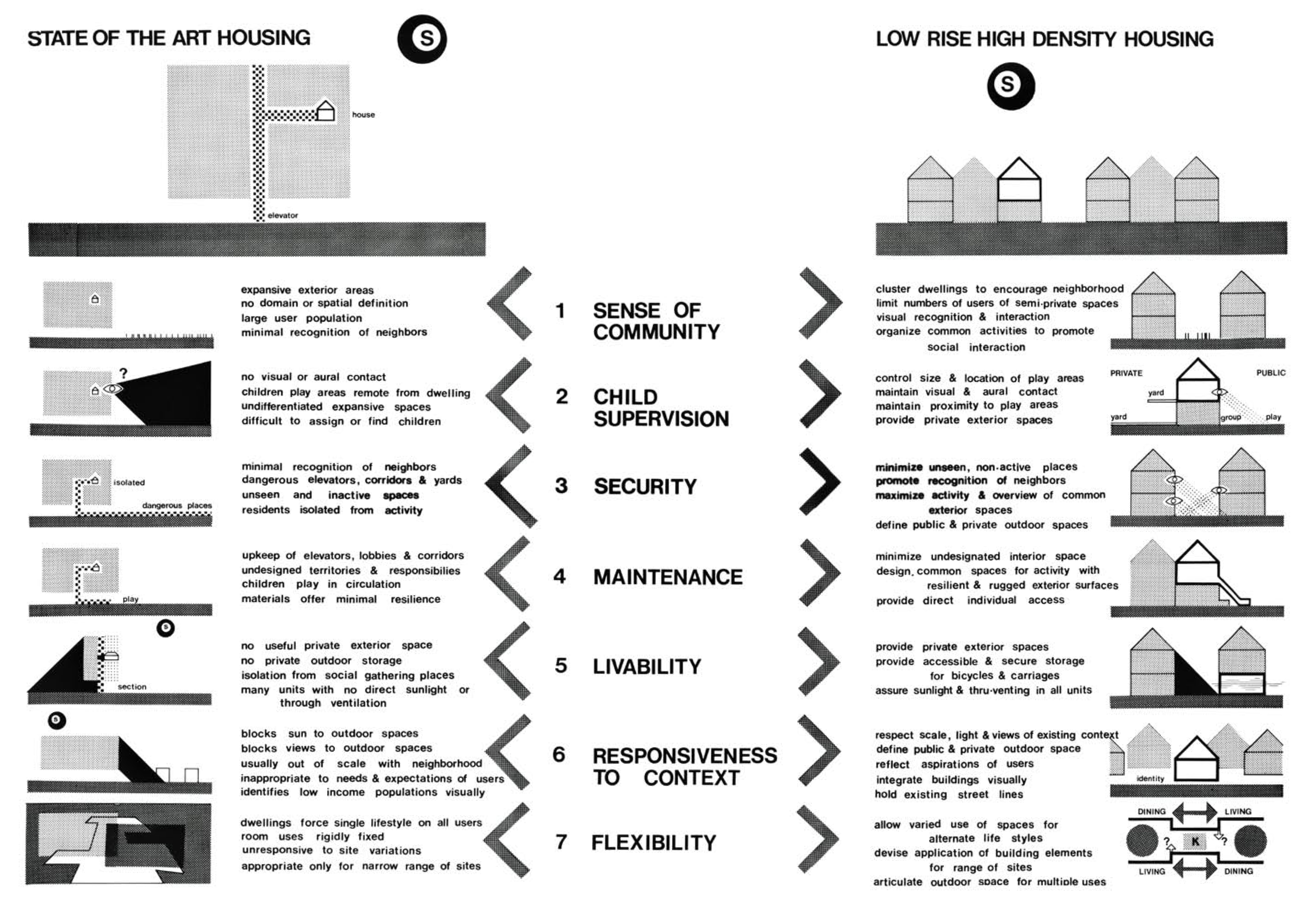 El texto de Frampton concluía con los resultados de una investigación de la Urban Development Corporation de Nueva York (UCD) en colaboración con el Instituto de Arquitectura y Estudios Urbanos (IAUS), donde él mismo trabajaba. Titulado Low Rise High Density Prototype, el trabajo venía acompañado de elocuentes diagramas explicativos del modelo teórico propuesto (Fig. 1) que pretendía, mediante la superposición de unidades en vez de su simple yuxtaposición, llegar a densidades netas de entre 170 y 220 viviendas por hectárea, muy lejos de las apenas 40 previstas en PREVI y alcanzadas en Siedlung Halen4. La aplicación de este modelo se concretó en el Marcus Garvey Park Village, primer gran hito del low-rise high-density norteamericano, al que seguirían otros conjuntos como Penn’s Landing Square, de Louis Sauer, con densidades algo menores —en torno a 120 viviendas por hectárea5— pero también con amplio reconocimiento internacional.