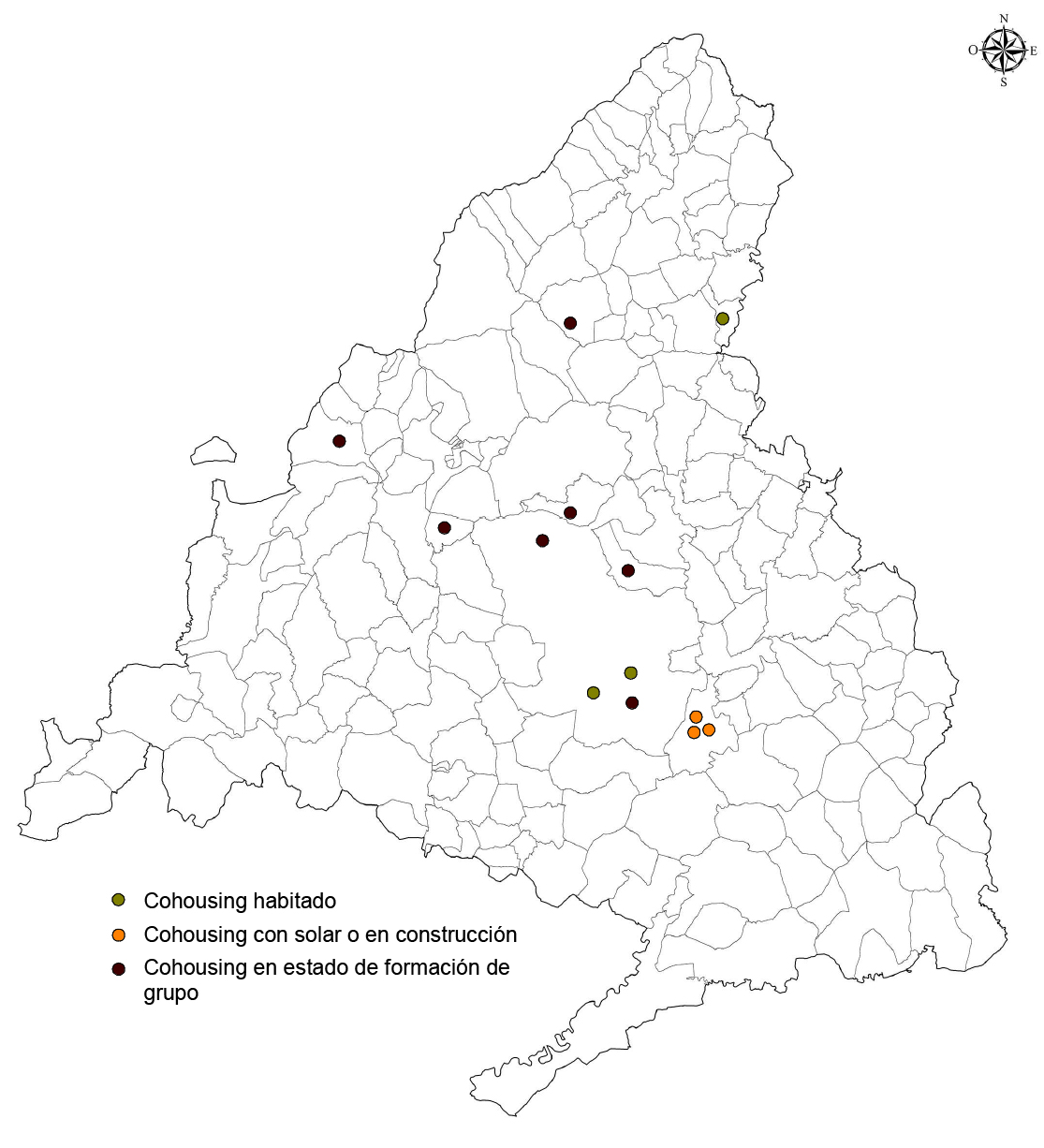 En la actualidad hay 14 casos de cohousing en la Comunidad de Madrid, de los cuales 12 surgen en la última década (desde 2014). Actualmente solo tres están habitados, si bien 2 están cerca de poder habitarse y otros tres con suelo adjudicado (Fig. 1) .