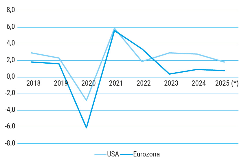 FIG. 2. Estados Unidos y Eurozona. Crecimiento del PIB, precios constantes. Tasas anuales de variación, 2018-2025 (previsión)