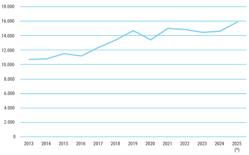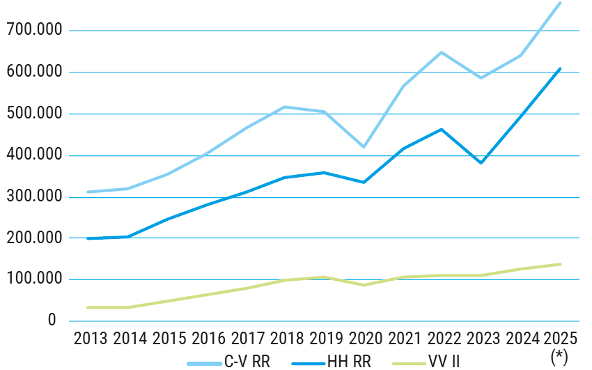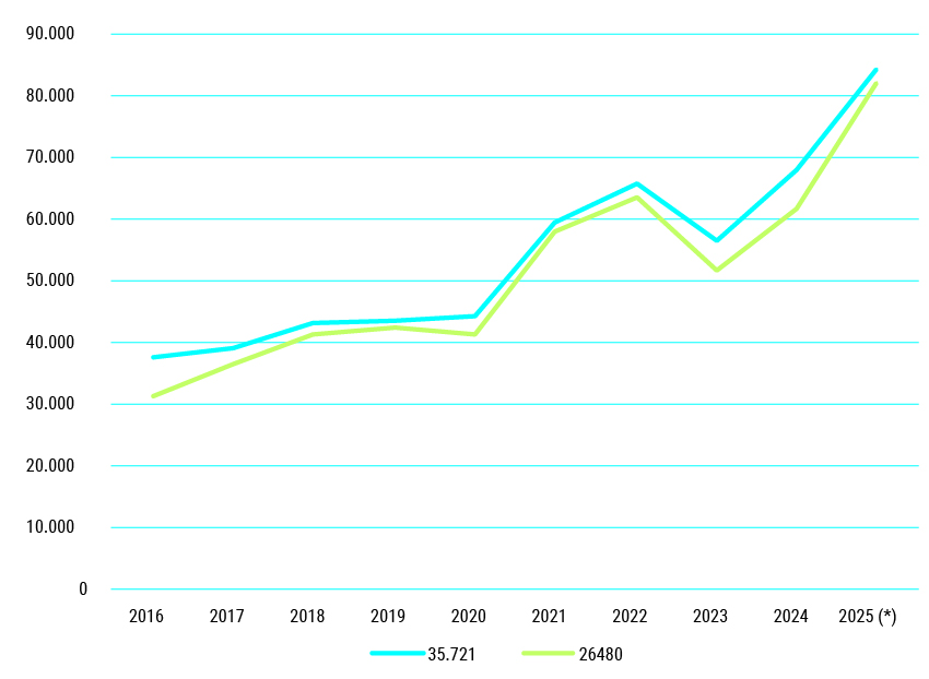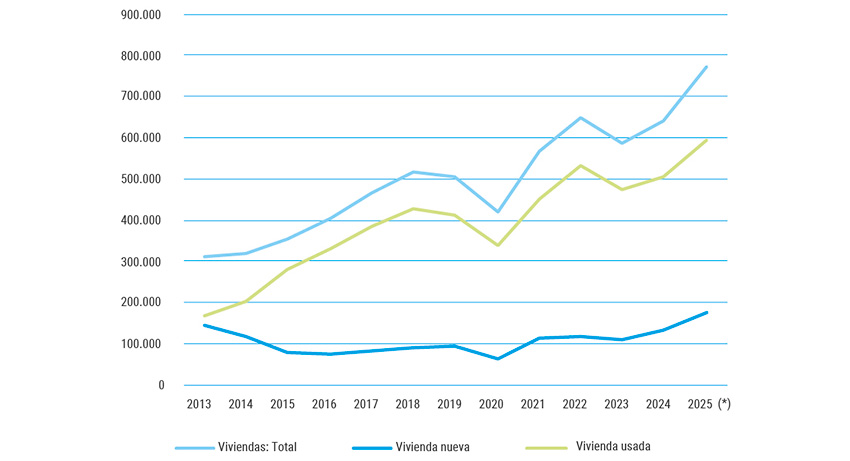 El crecimiento de las ventas de viviendas en el primer semestre de 2025 sobre el mismo periodo del año anterior, el 20,1%, duplico la tasa de variación anual de 2024. La previsión que se deriva de dicha evolución es de unas ventas en 2025 que pueden superar las 770 000 (641 919 en 2024) (Figs. 15 y 16). El crecimiento interanual de las ventas en el primer semestre fue el 31,8% en el caso de las viviendas de nueva construcción, mientras que el aumento de las ventas de viviendas usadas fue el 17,2%. Las ventas de viviendas usadas alcanzaron el 77,3% del total de ventas, mientras que las ventas de viviendas de nueva construcción supusieron el 22,7% de dicho total.