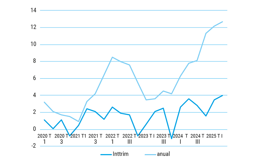 La construcción de nuevas viviendas ha fortalecido el ritmo de aumento en 2024-2025. El consumo aparente de cemento aceleró el crecimiento desde el 0,8% de 2024 al 8,8% registrado en el periodo enero-agosto de 2025 (Fig. 19). Destacó sobre todo el crecimiento del 15,1% experimentado en agosto de 2025 respecto del mismo mes del año precedente.