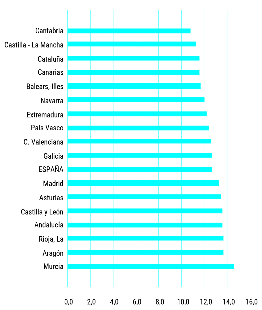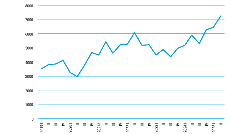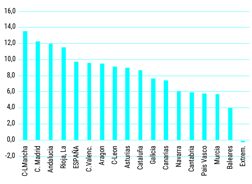Las ventas de viviendas y el número de hipotecas registradas casi duplicaron en 2025 el crecimiento del año precedente (Fig. 4), mientras que se desaceleró el aumento de las viviendas iniciadas. Los precios de las viviendas, medidos por el índice de precios elaborado por el INE, aceleraron este año el ritmo de crecimiento, que alcanzó al 12,7% interanual en el segundo trimestre de 2025 (Fig. 5). Se trata de la mayor variación interanual registrada por el citado indicador desde que se inició su elaboración. Por comunidades autónomas, la variación interanual más acusada en el segundo trimestre de 2025 fue la de Murcia (14,6%), mientras que la variación más reducida en cuanto a crecimiento fue la de Cantabria (10,8%) (Fig. 6).