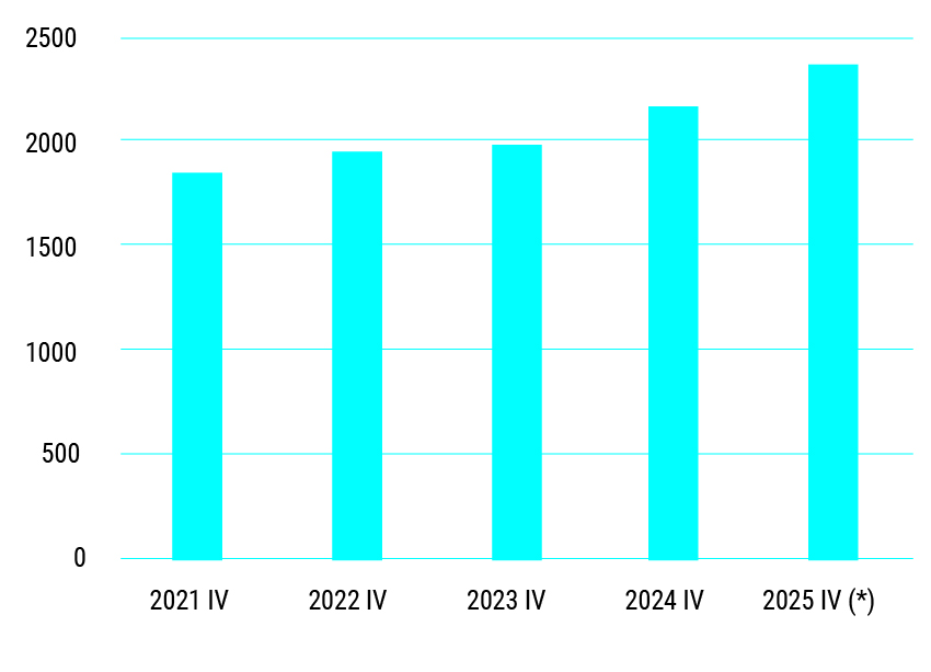 FIG. 7. Precios de las ventas de viviendas registradas, Euros/m2.Datos anuales 2021-2025 (previsión), 4º trimestre)