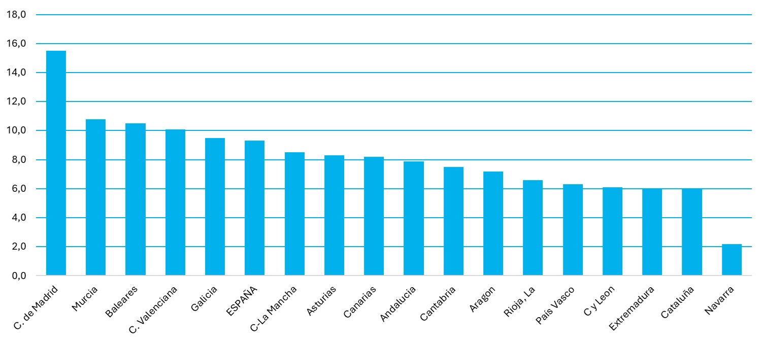 FIG. 6: Índice de precios de vivienda (100=2015). Tasas de variación interanual (%), 2ºtrimestre de 2025, España y CC. Autónomas