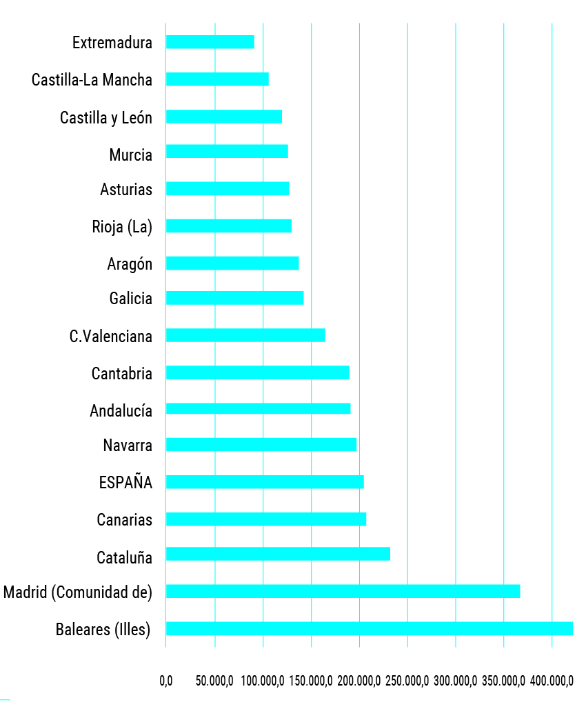 El precio medio unitario de las viviendas vendidas en el segundo trimestre de 2025, según la Estadística Registral Inmobiliaria, ascendió a 2251 euros/m2. Dicho nivel implicó una variación interanual del 9,4% (Fig. 7). Las autonomías con precios de ventas más elevados en dicho trimestre de 2025 fueron las de Madrid (4067 euros/m2) y Baleares (3946 euros/m2). Las autonomías con precios más reducidos fueron las de Castilla-La Mancha (997 euros/m2) y Extremadura (881 euros/m2) (Fig. 8). Los mayores valores de tasación en el primer trimestre de 2025 fueron los de Baleares, 422 502 euros, y Madrid (366.526). Extremadura, con 91 354 euros, presentó el nivel más reducido (Fig. 9).
