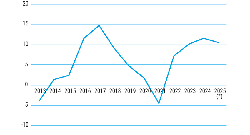 FIG. 10. Alquileres, España. Tasas de variación anual, 2013-2025 (previsión) (%)