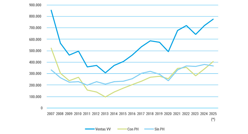 FIG. 17. Ventas de viviendas, con y sin prestamo hipotecario. Datos anuales, 2008-2025 (previsión)
