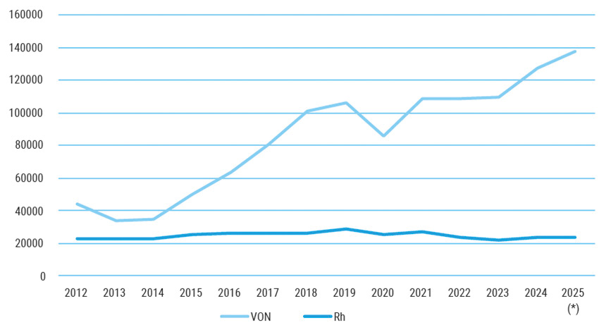 El mercado de vivienda se ha fortalecido en 2024 y 2025 por los descensos registrados por los tipos de interés, tanto del Euribor a 12 meses como por los de los préstamos a comprador de vivienda. De un tipo medio mensual del 4,33% en octubre de 2023 de los préstamos a comprador de vivienda se ha pasado a un tipo del 2,79% en agosto de 2025 (Fig. 12). Dicho descenso no solo ha abaratado las cuotas de los préstamos a largo plazo para compra de viviendas, sino que han actuado como revulsivo en la compra de vivienda como activo, mejorando la rentabilidad neta de la misma.