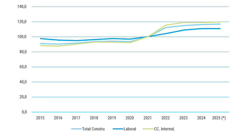 FIG. 21. Índices de costes de la construcción. Índice general, costes laborales y de costes de consumos intermedios (100=2021). Datos medios anuales, 2015-2025 (previsión)
