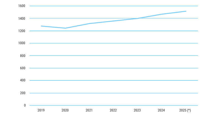 Después de 2020, año de la pandemia, el empleo en la construcción ha registrado crecimientos medios anuales significativos, entre los que destacan el 4,9% de 2024 y el 3,7% en el primer semestre de 2025, según los datos procedentes de la Encuesta de Población Activa. La previsión para 2025 es que en 2025 el empleo medio total en la construcción superará los 1,5 millones de ocupados (Fig. 22), nivel ya alcanzado en el segundo trimestre de este año.