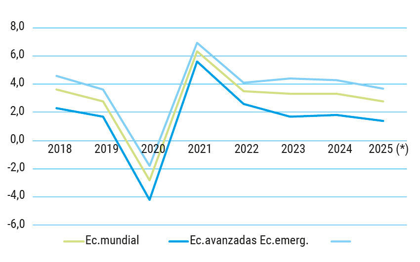 FIG. 1. Economía mundial, países desarrollados y países emergentes. Tasas de variación anual del PIB, precios constantes, 2018-2025 (previsión)