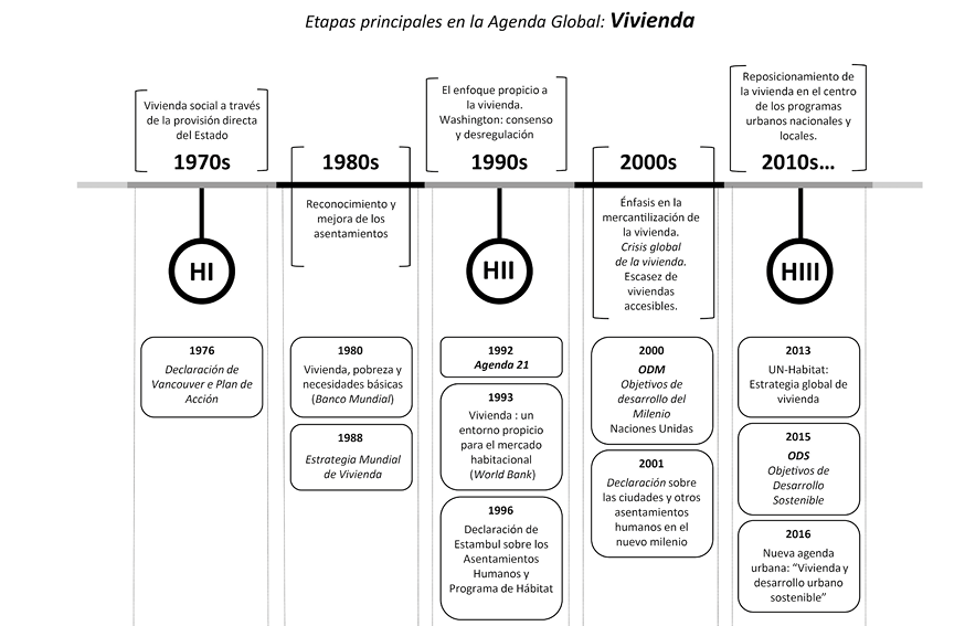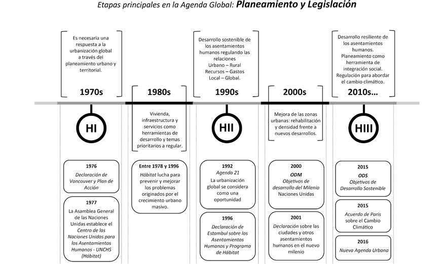 La tabla comparativa de las Declaraciones y Planes de Acción de las Conferencias sobre Asentamientos Humanos Hábitat I, Hábitat II y Hábitat III permite apreciar los desplazamientos semánticos y el progreso incremental hacia una definición más ajustada al terreno de políticas e instrumentos operativos de planificación y gestión, así como su progresiva orientación a la consecución de objetivos definidos de organización territorial y espacial a diversas escalas. Por otra parte, las líneas de tiempo de las etapas seguidas en la gestación de las políticas de vivienda y planeamiento y gestión (Fig. 3) permiten visualizar el paralelismo y convergencia de ambos itinerarios.