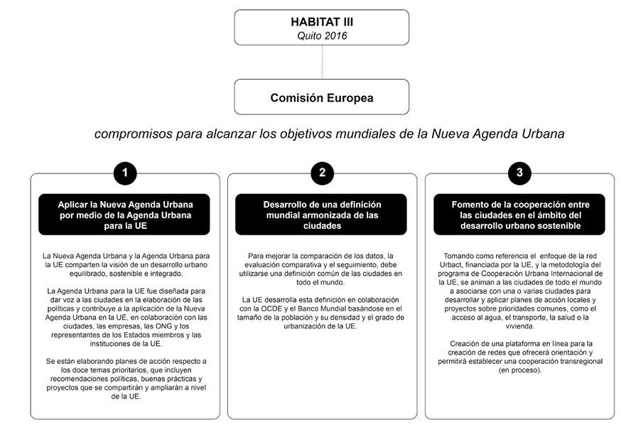 En el ámbito europeo es importante referirnos a los vínculos de retroalimentación y coherencia en los procesos de formulación de la Nueva Agenda Urbana, los Objetivos de Desarrollo Sostenible y Agenda Urbana para la Unión Europea. Éste último documento hace un llamamiento para que las instituciones europeas garanticen la adecuación del Pacto de Ámsterdam a la Nueva Agenda Urbana, así como la incorporación de la Agenda europea al proceso de localización de la Agenda 2030.