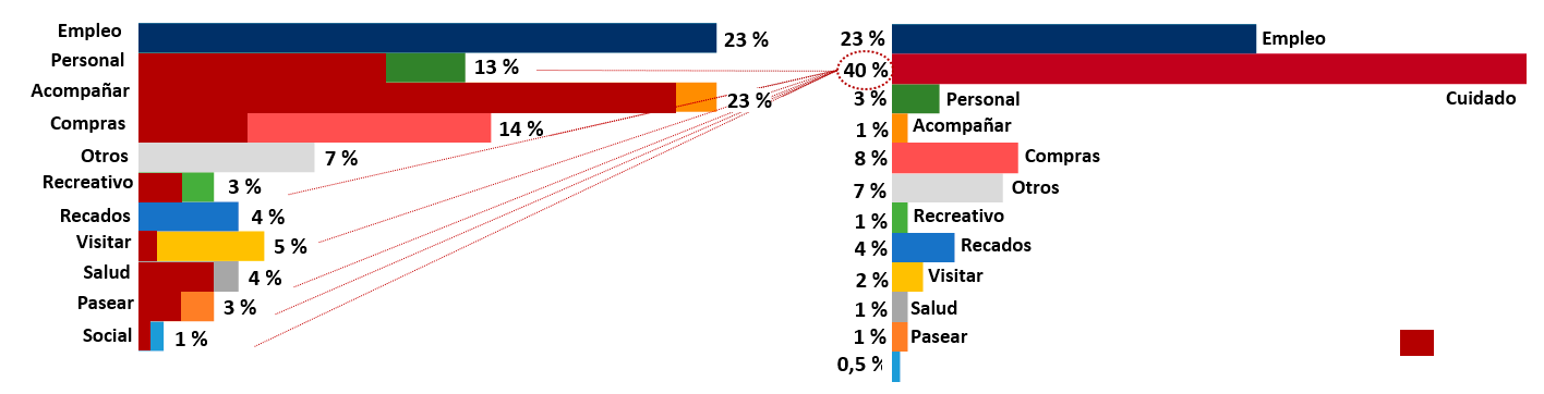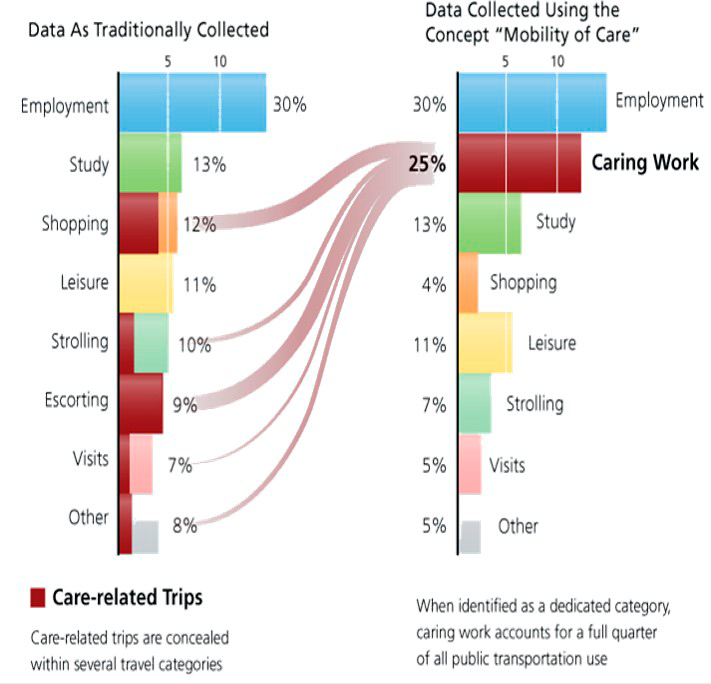 Una tercera conclusión es la confirmación de la importancia de utilizar una nueva categoría paraguas que hace visible el tamaño de la movilidad relacionada con el cuidado que hoy en día está oculta bajo una variedad de categorías que normalmente utilizan las encuestas de transporte en todo el mundo. La representación gráfica del mismo conjunto de datos utilizando las categorías antiguas a la izquierda y las nuevas a la derecha, ayuda a ilustrar este punto.