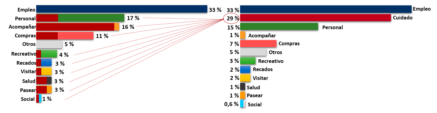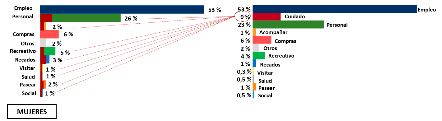 Del total de viajes realizados por mujeres, las trabajadoras a tiempo parcial representan el 61% y el 39% restante se distribuye en partes casi iguales entre quienes trabajan a tiempo completo y quienes no tienen empleo. La proporción de viajes relacionados con actividades para la reproducción social entre mujeres con trabajo remunerado es tres veces mayor que entre hombres en la misma situación.