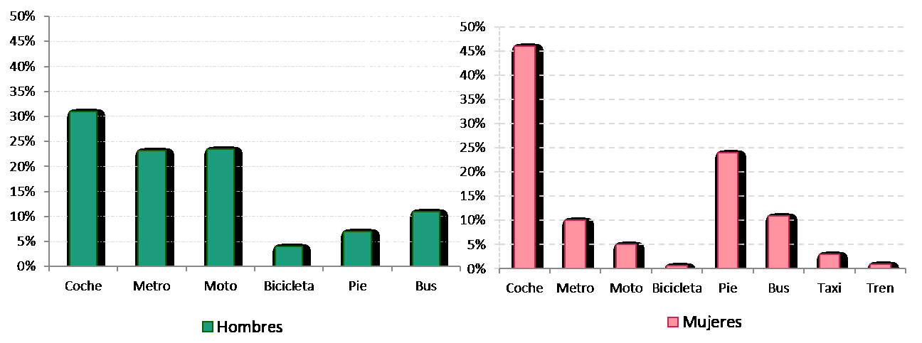 La Fig. 6 muestra los medios de transporte utilizados por hombres y mujeres del total de viajes realizados por cada grupo. Las mujeres hacen el 45% de sus viajes en automóvil, el 24% a pie, el 20% en transporte colectivo (que se comparte casi por igual en autobús y metro) y solo el 5% en motocicleta. Los hombres utilizan principalmente el coche (30%), el metro (23%) y la moto (24%).
