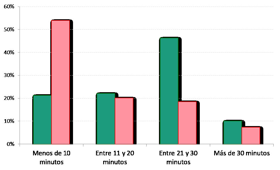 Fig. 10/ Duración media de los viajes, distribución por sexo. Población de 30-45 años, Madrid 2014.