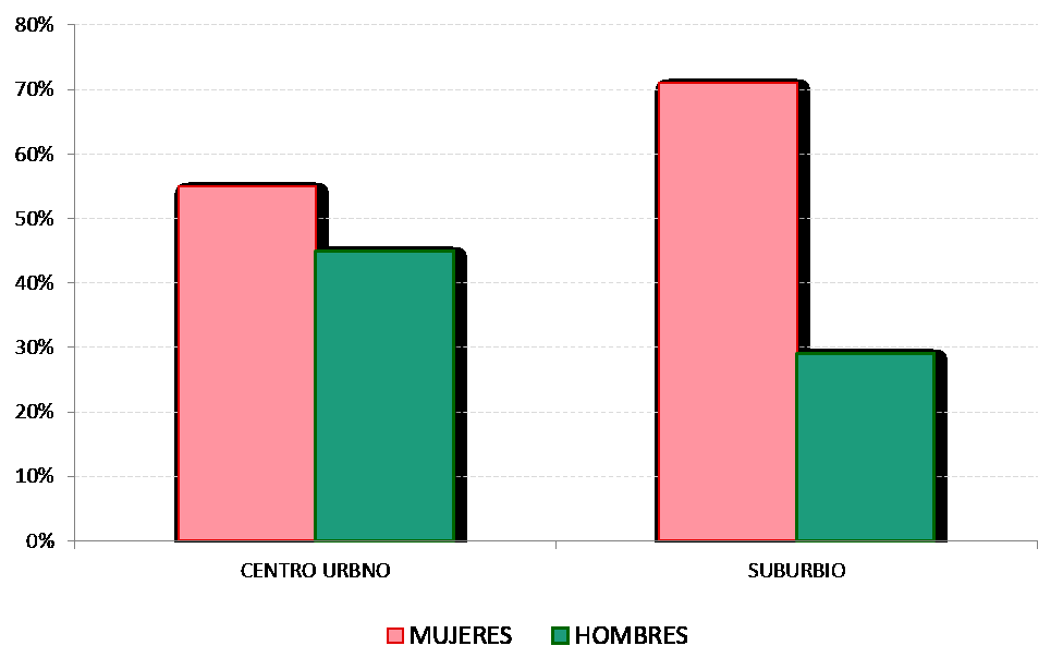 También es interesante comparar la cantidad de viajes realizados para el cuidado según el lugar de residencia. El número total de viajes para actividades de cuidado casi se duplica para las personas que viven en las áreas suburbanas, en comparación con las que viven en el centro. También es significativo ver que en estas áreas la brecha de género se multiplica varias veces: mientras que en el centro la brecha es del 10%, en las áreas suburbanas la brecha aumenta cuatro veces más, con el 40%. En las zonas periféricas las mujeres realizan la mayoría de las tareas de cuidado.