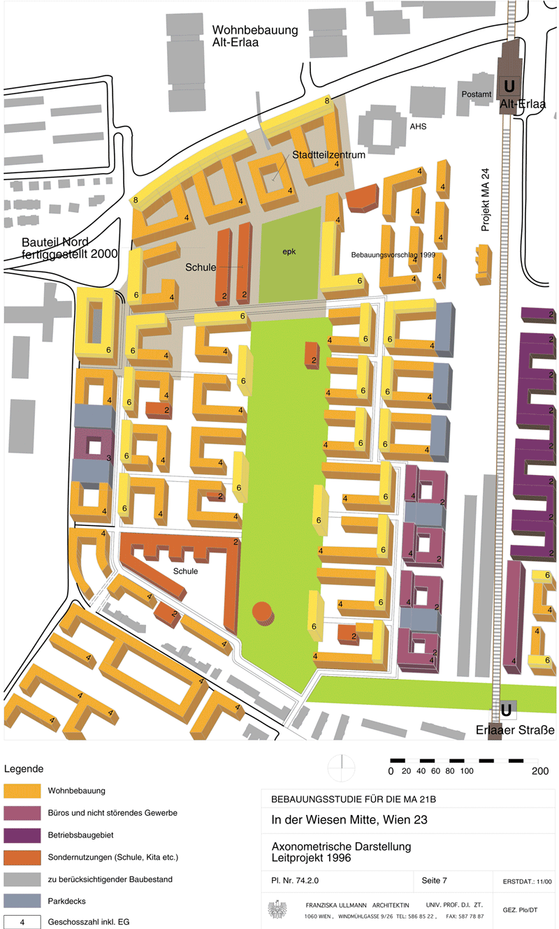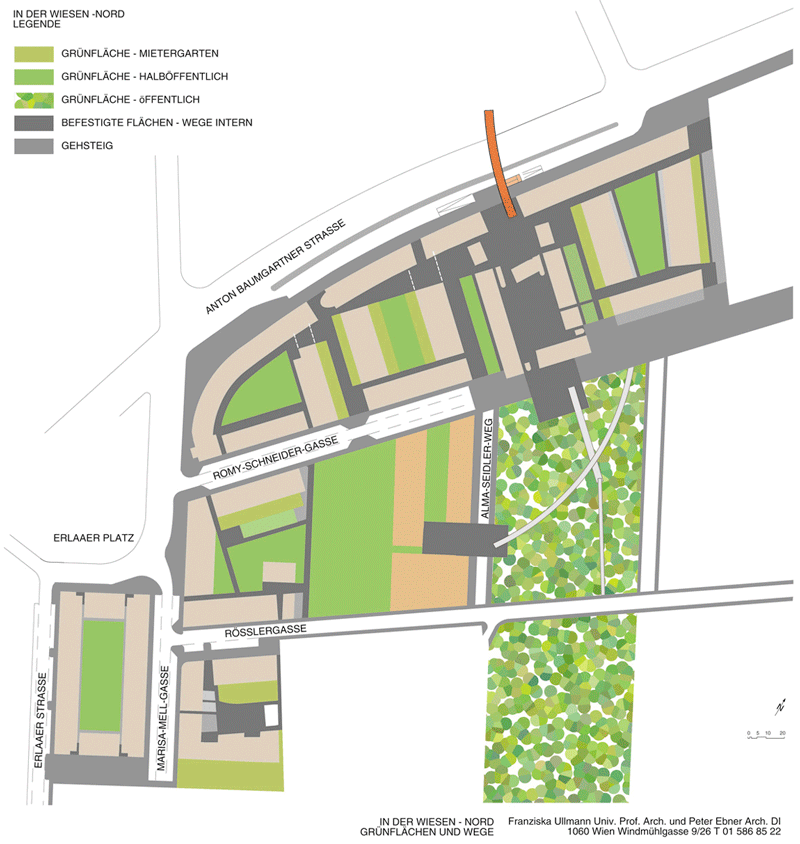 En la segunda fase de planificación, detallada a nivel de manzanas, se desarrolla la parte norte del ámbito (In der Wiesen Nord), propiedad del WBSF (Wiener Stadterneuerungsfond: Fondo Municipal de Provisión de Suelo y Renovación Urbana, fundado en 1984), como base para los posteriores concursos de promoción a nivel de manzana5. La estructura por manzanas se remata por una edificación lineal al norte, a lo largo de la calle Anton Baumgartner –de varios carriles de tráfico intenso–, que sirve de protección contra el ruido y el viento. El zócalo está planificado con una altura de los locales suficiente para permitir usos mixtos en un 1 o 2 niveles. La pasarela peatonal sobre la calle Anton Baumgartner, al norte, constituye la unión y conexión con el barrio de Alt Erlaa. Para que el camino hacia la estación de metro y la conexión al transporte público sean lo más atractivos y seguro posible, se han dispuesto las entradas y salidas de los aparcamientos subterráneos en carriles laterales paralelos impidiendo el acceso de los vehículos directamente a la acera.
