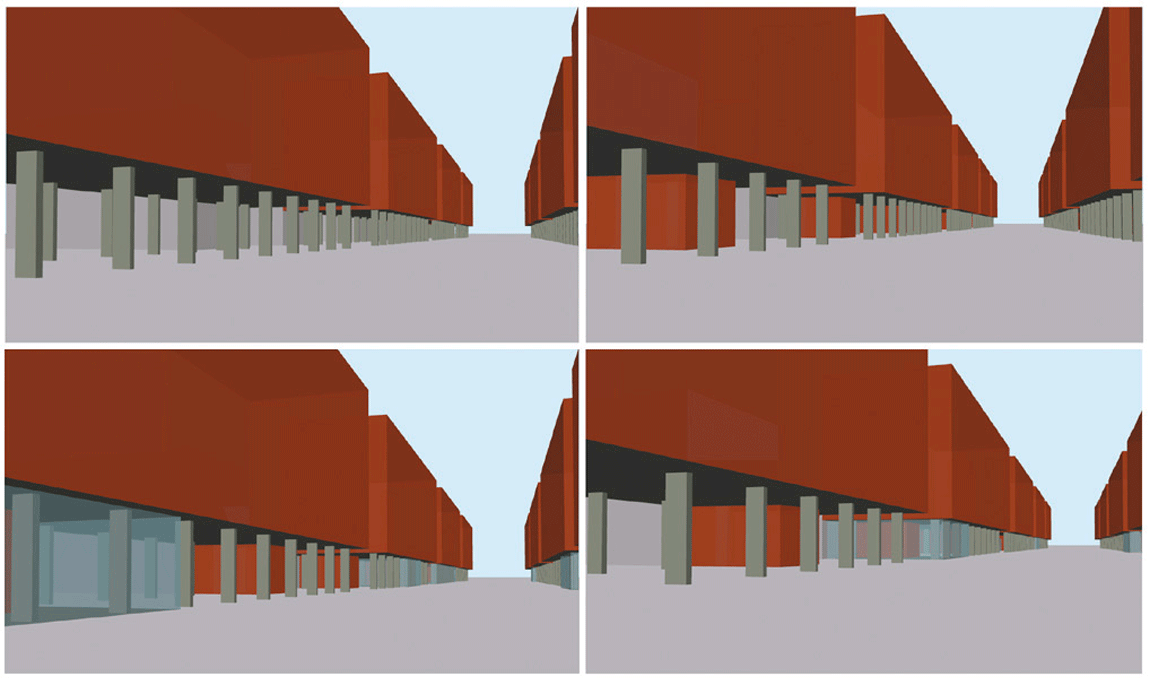 Fig. 12 y 13/ Accesos al aparcamiento subterráneo en el carril lateral y Zona delantera con zócalo de dos plantas.