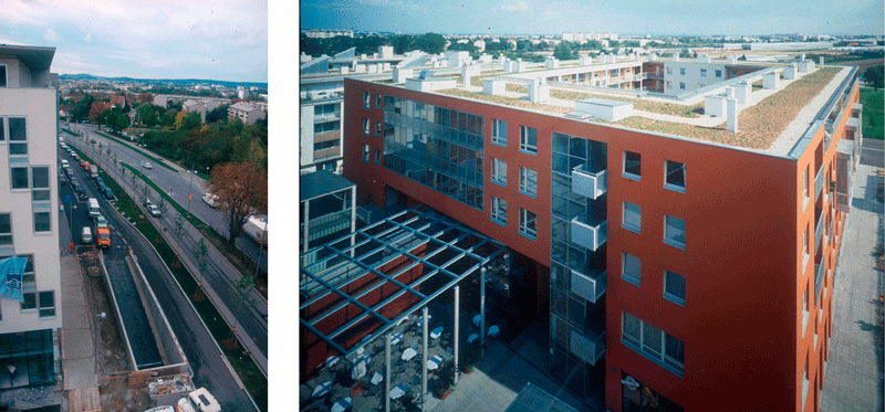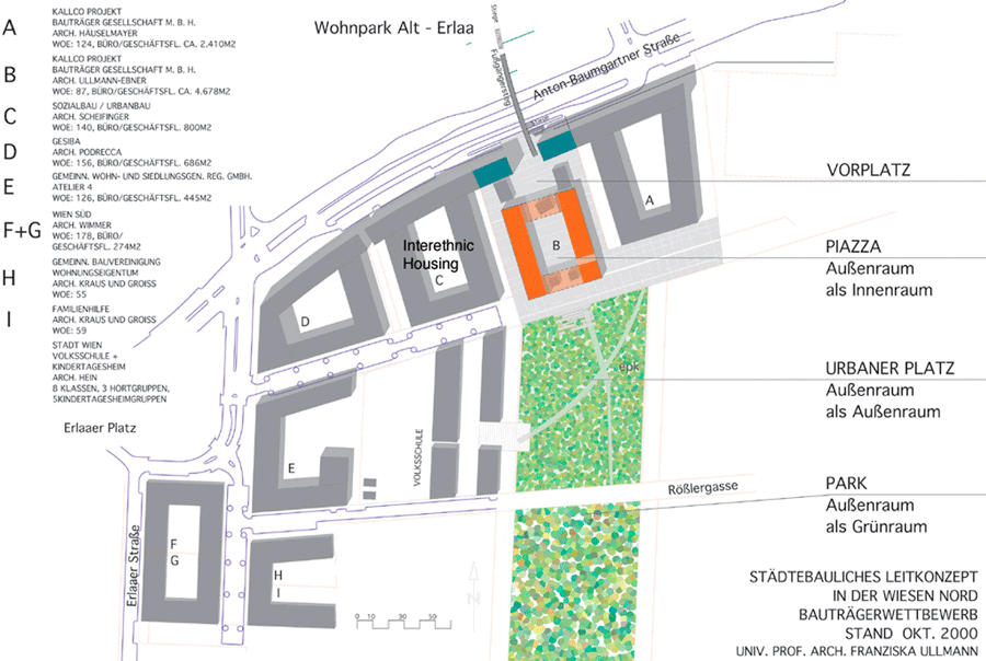 4Datos del Proyecto In der Wiesen Nord: Plan general 1996-98, 2001 planificación y ejecución por Franziska Ullmann y Peter Ebner. Promotor: Kallco Project y Kallco Construct. Programa: Edificio de oficinas y estructura en manzanas con alojamiento intergeneracional: dos edificios de oficinas como torres de acceso al barrio: aprox. 4000 m2 de oficinas y tiendas. Interior de manzana: aprox. 5000 m2, locales en planta baja, centro médico en la planta.
