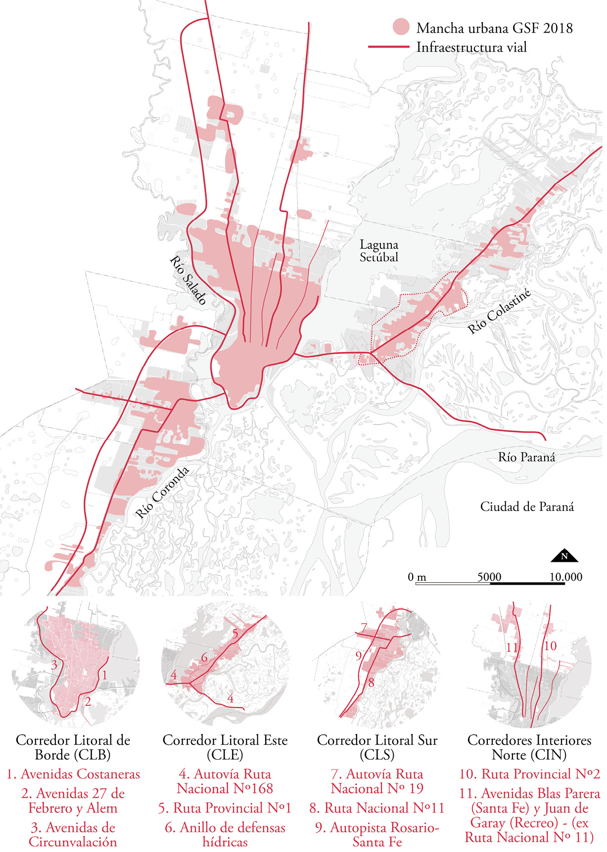 - Corredor Litoral de Borde (CLB): a lo largo de las costas este, sur y oeste de la ciudad de Santa Fe.