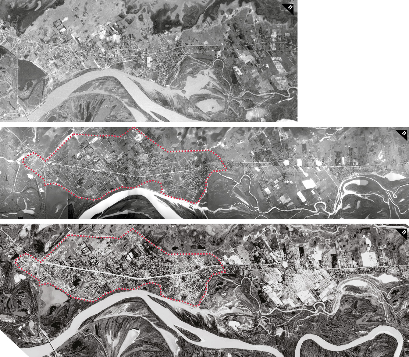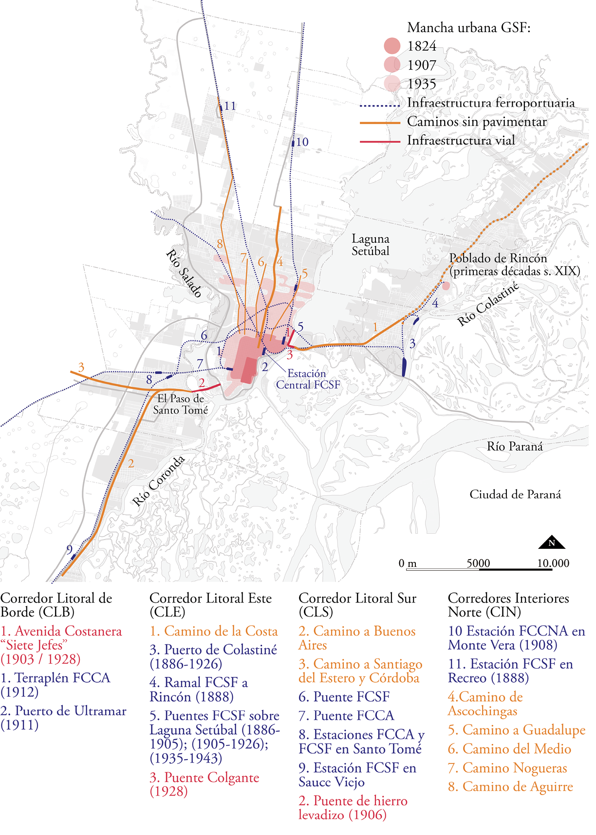 En relación con el crecimiento urbano en los bordes de la ciudad central (CLB), en esta época ya comenzó a evidenciarse una ocupación diferenciada, con un borde (este) valorado y embellecido a partir de diversas intervenciones urbanísticas, como la construcción del primer tramo de la Avenida Costanera sobre la Laguna Setúbal; y otro borde (oeste) denigrado y destinado a usos urbanos «indeseables». En cuanto a los corredores que ofrecían una conexión con los territorios ubicados al norte de la ciudad central (CIN), cabe señalar que el incipiente desarrollo del «camino a las chacras» se encontró fuertemente vinculado a la agricultura frutihortícola; un perfil que, sobre todo en el caso de Monte Vera, se mantiene todavía vigente. |