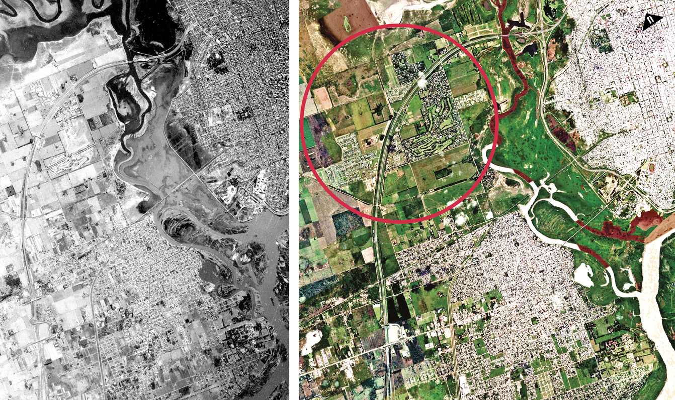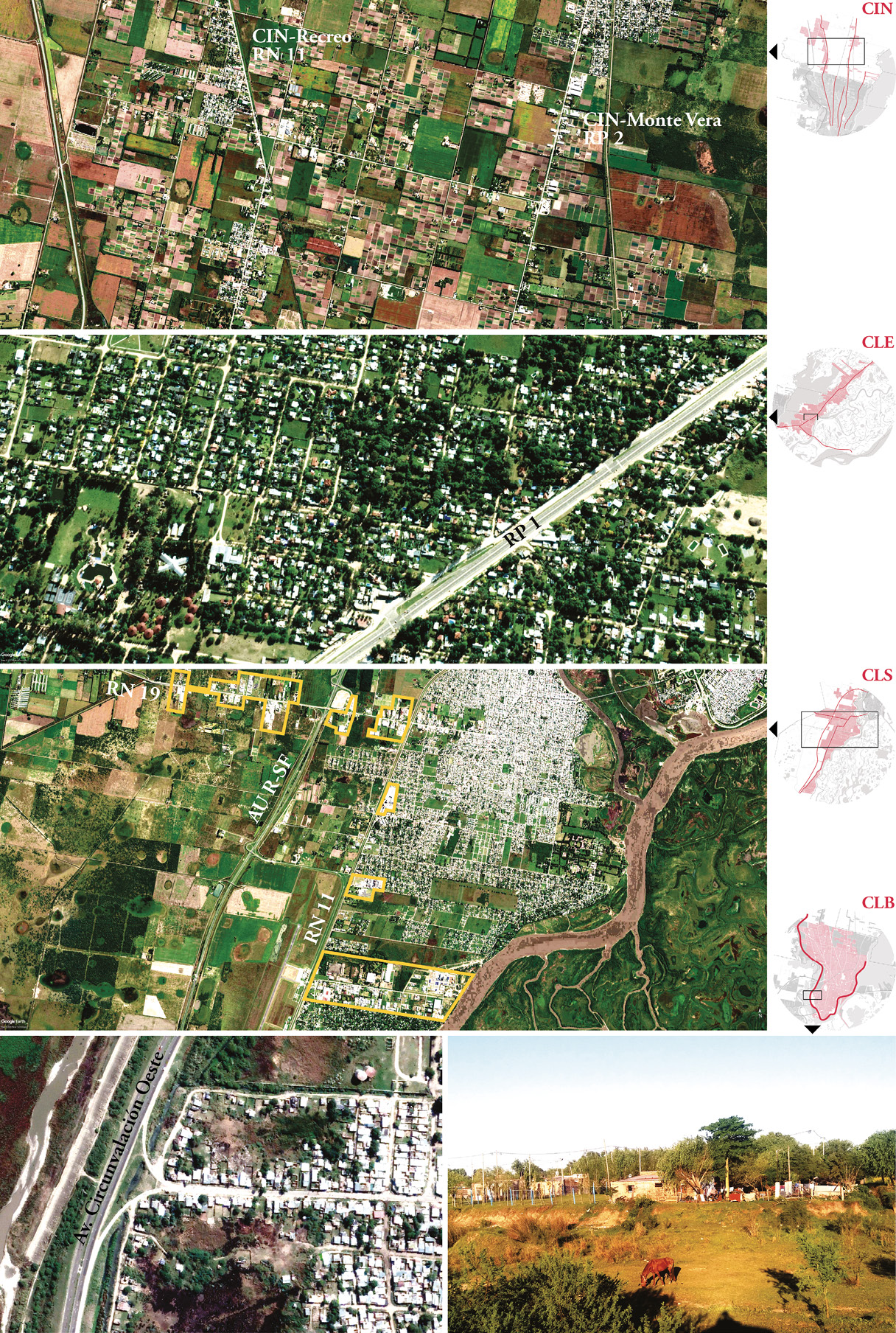 La mancha urbana del GSF inició un proceso de expansión que definió las características dominantes de cada uno de los CEU. Así, el carácter diferencial otorgado a las obras de defensa ejecutadas sobre los dos bordes de la ciudad de Santa Fe (CLB), ampliaron la brecha –o degradé socio-espacial– entre el borde este, valorado estética y paisajísticamente, y el borde sudoeste, denostado y concebido como «contrafrente» de la ciudad. Por su parte, en el tramo de la RP1, el CLE se consolidó cada vez más como un eje turístico y recreativo, donde el paisaje costero se convirtió en el recurso de una amplia representatividad cultural. Al mismo tiempo, el CLS, en vinculación con los centros productivos de Córdoba y Rosario a través de la RN19 y la RN11, condensó a lo largo de su desarrollo la actividad industrial del GSF, con el emblema de la FIAT a la cabeza. Finalmente, los CIN (Recreo y Monte Vera) comenzaron a consolidarse como un continuum urbano-rural donde la mancha proveniente del «sur urbano» comenzó a expandirse sobre las antiguas lonjas que antes habían sido destinadas a chacras y estancias. |