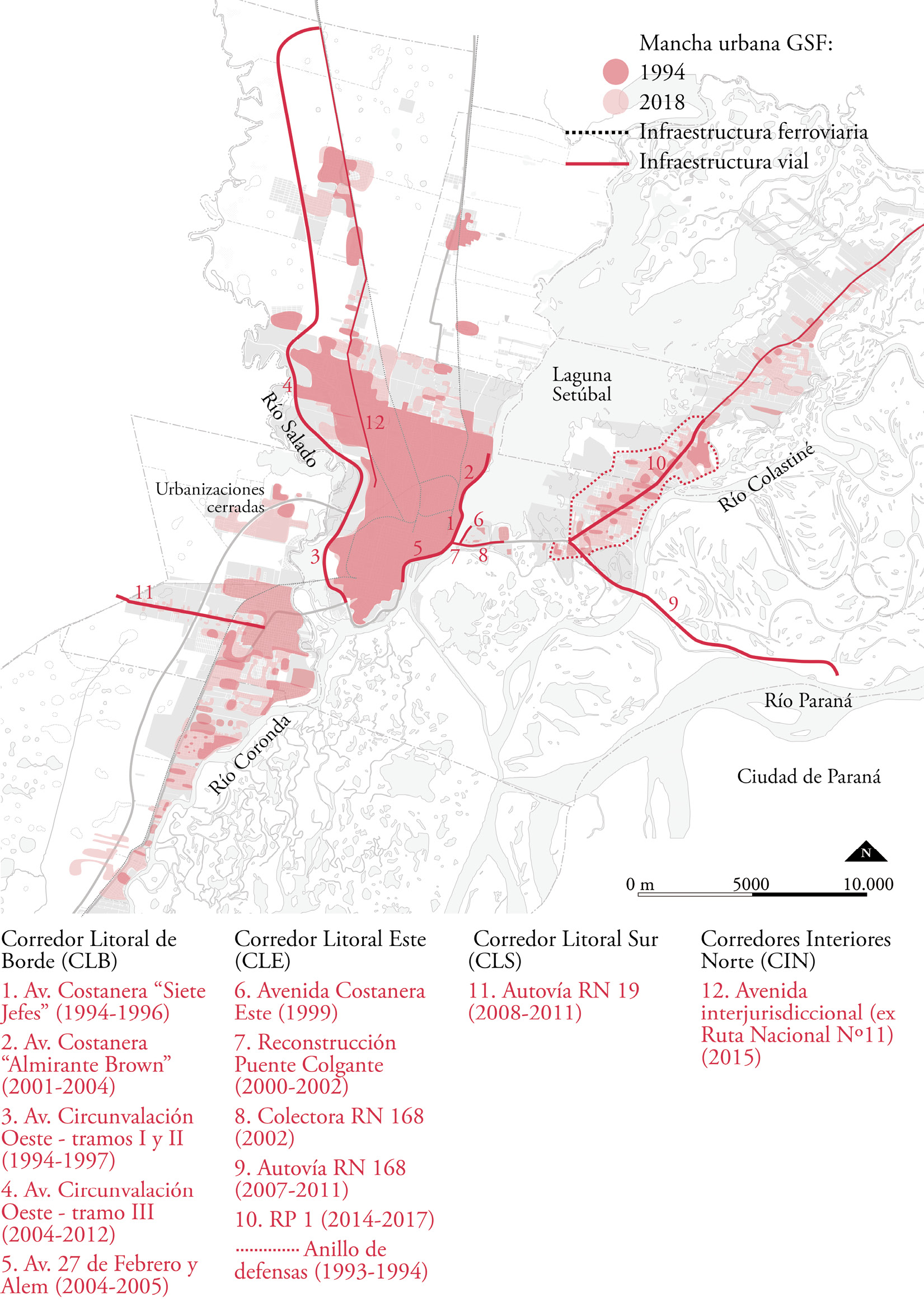 Las obras de defensa hídrica ocuparon un lugar central en las políticas urbanas del GSF, sobre todo, tras las inundaciones que afectaron a la ciudad y a su área de expansión entre principios de la década de 1980 y el año 2007. En el CLB, estas intervenciones se materializaron a través de la reconstrucción de la Avenida Costanera sobre la Laguna Setúbal y de la Avenida Circunvalación Oeste, sobre el Río Salado. Estas dos obras profundizaron aún más las diferencias históricas entre el «frente y contrafrente» de la ciudad de Santa Fe, consolidando, también, un crecimiento cada vez más sostenido de la mancha urbana sobre aquellas zonas más desfavorecidas, vulnerables y desprovistas de servicios. En el CLE, estas obras dieron paso a la concreción de los anillos de defensa hídrica que impulsaron la posterior ocupación –ya no esporádica, de «fin de semana», sino permanente– de las áreas ubicadas sobre el lecho del Río Paraná. Al mismo tiempo, se concretaron algunas obras pendientes, cuya proyección y anuncio había sido realizada durante las décadas anteriores: el ensanche de las avenidas «Leandro Alem» y «27 de febrero» (CLB-Este), la finalización de la Autovía 168 (CLE) y la conversión en Autovía de la RN19 (CLS). Todas ellas se vinculan a un sistema vial dirigido a conectar a la Mesopotamia con el resto del país; sobre todo, a partir de la incorporación del GSF en el trazado del Corredor Bioceánico Central. |
