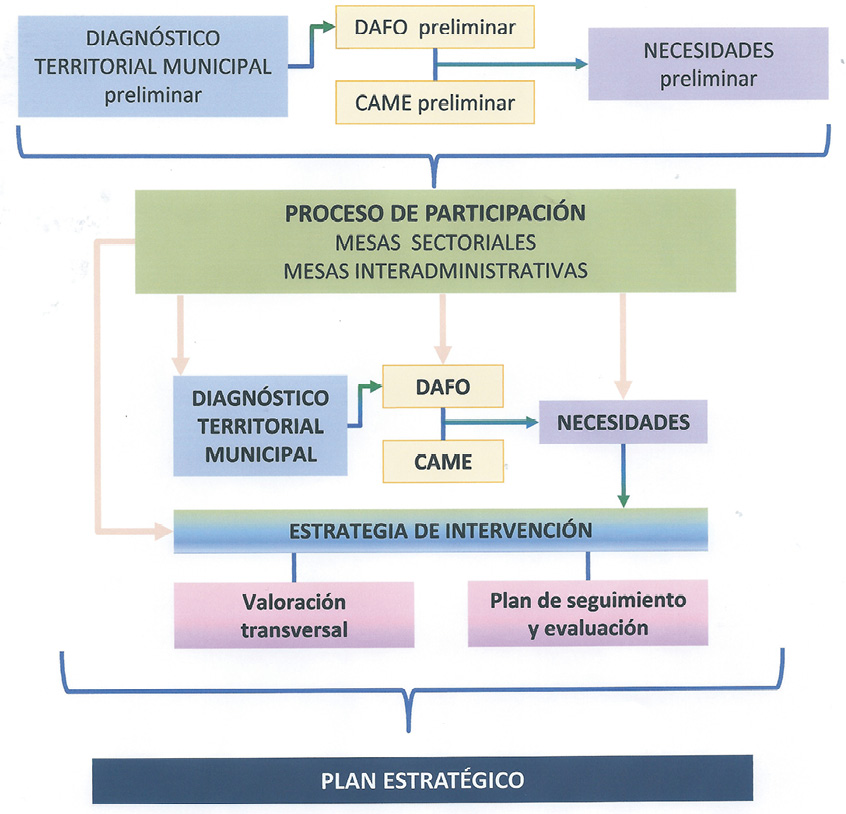Esta metodología se compone de cinco fases claramente diferenciadas, y como ya se ha dicho con anterioridad, todas ellas interconectadas: Diagnostico territorial, Caracterización y evaluación, Detección de necesidades, Estrategia de intervención, y Plan de seguimiento y evaluación. Fases, todas ellas, que son complementadas con la organización de procesos de participación organizados en dos niveles, como son, por un lado, la entrevista con los agentes clave en el territorio organizados de forma individual o en mesas sectoriales, y, por otro, la puesta en marcha de un proceso de participación abierto para toda la ciudadanía. Ambas modalidades de participación vienen a complementar y contrastar la información recogida en las distintas fases de elaboración del documento (ver Fig. 1).