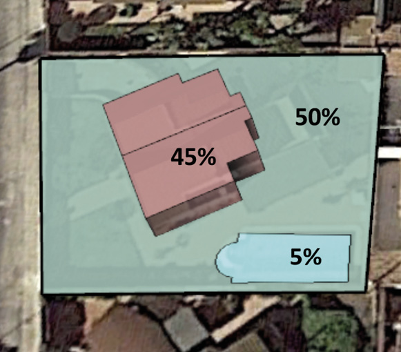 En cuanto a la tipología de chalés (donde el espacio ajardinado es mayor por vivienda), el volumen de agua requerido puede variar en función de las características de espacio ajardinado: superficie, tipo de vegetación, sistema de riego, conocimiento en jardinería, uso de recursos hídricos no convencionales (pluviales y/o aguas regeneradas), etc. Respecto a la tipología de la vegetación cabe destacar como un elemento de alto consumo el césped (Morote & Hernández, 2014). Tampoco cabe olvidar que los espacios verdes y sus características también se ven condicionados por factores como el precio del agua, nivel de educación-formación y grado de concienciación ambiental de los residentes (Hurd, 2006). Por lo tanto, la economía del hogar es determinante a la hora de estudiar la relación existente entre el consumo hídrico y el uso que se hace dentro del hogar. Para el caso de la muestra escogida de los chalés de San Javier, las parcelas se caracterizan por tener una extensión media de 672 m² (siendo la mayor de la muestra de 1.988 m2 y la menor de 320 m2). Respecto a la superficie media de los diferentes elementos que constituyen una parcela cabe destacar que el espacio destinado al jardín (teniendo en cuenta áreas pavimentadas) representa el 50% (336 m2), el espacio destinado a la vivienda el 45% del total (302 m2), y el 5% restante a la piscina (34 m2) (Fig. 10).