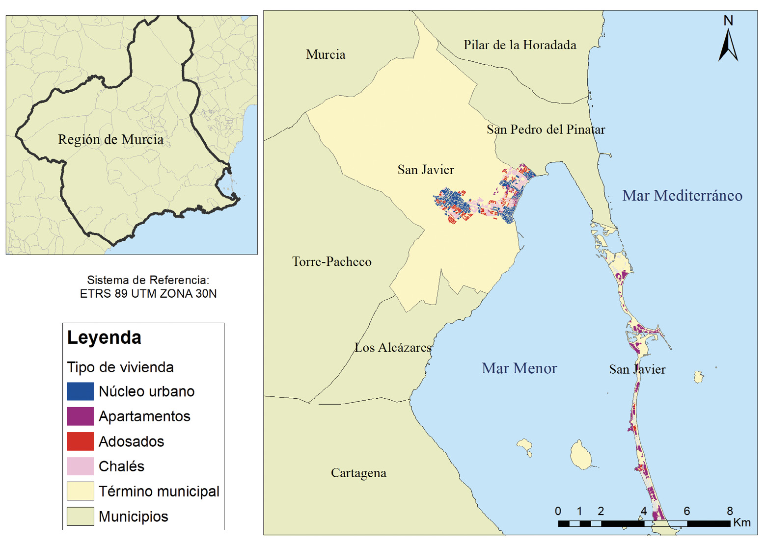 Conocer la representatividad de las diferentes tipologías urbanas es de sumo interés debido a la repercusión en el consumo y demanda de agua. En este sentido, las áreas urbanas de alta densidad tienen un consumo menor que las zonas de baja densidad. La urbanización en altura permite una gestión más eficiente del agua ya que se disminuye la longitud de la red de distribución reduciendo las pérdidas, tiempo de reparación de la misma o la detección de fugas u otras irregularidades (Rico, 2007). Por otra parte, la dimensión y características de la vivienda de chalés son variables fundamentales a tener en cuenta a la hora de la planificación territorial sobre todo si el área donde se implantan se caracteriza por ser un territorio marcado por la escasez de precipitaciones y la competencia por los usos del agua. Para San Javier, esto es una cuestión importante, donde el ATS o la aparición de nuevos recursos no convencionales (caso de la desalinización) están desempeñando un papel crucial para garantizar el abastecimiento.